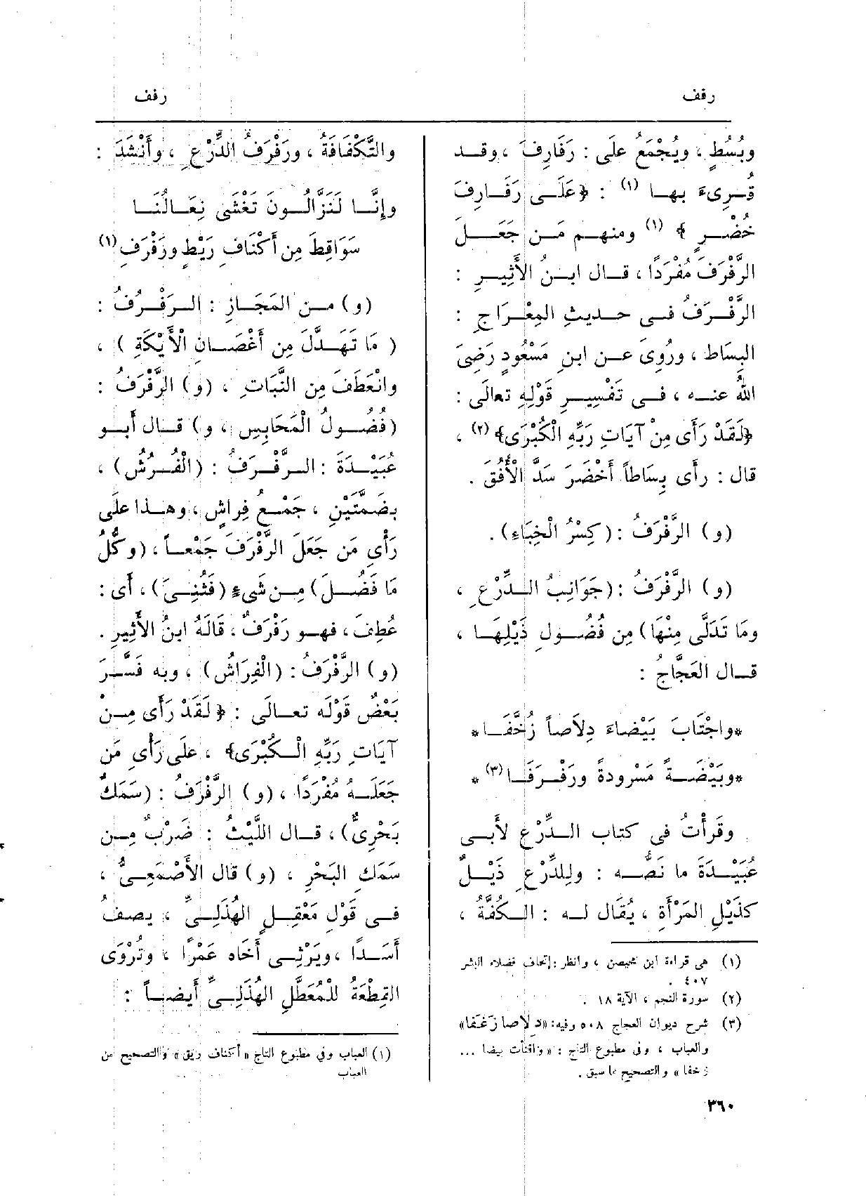 وبُسُطٍ، ويَجْمَعُ علَى: {رَفَارِفَ، وَقد قَرِئَ بهَا:) عَلَى رَفَارِفَ (، وَقد قُرِئَ بهَا:) عَلَى رَفَارِفَ خُضْرٍ (وَمِنْهُم مَن جَعَلَ} الرَّفْرَفُ مُفردا قَالَ ابْن الْأَثِير: الرفرف فِي حديثِ المِعْرَاجِ: البِسَاط، ورُوِيَ عَن ابنِ مَسْعُودٍ رَضِيَ اللهُ عَنهُ، فِي تَفْسِيرِ قَوْلِهِ تَعَالَى:) لَقَدْ رَأَى مِنْ آَيَاتِ رَبِّهِ الكُبْرَى، قَالَ: رأَى بِسَاطاً أَخْضَرَ سَدَّ الأُفُقَ. الرَّفْرَفُ: كِسْرُ الْخِبَاءِ. الرَّفْرَفُ: جَوَانِبُ الدِّرْعِ، ومَا تَدَلَّى مِنْهَا مِن فُضُولِ ذَيْلِهَا، قَالَ العَجَّاجُ: واجْتَابَ بَيْضاءَ دِلاَصاً زُخَّفَا وبَيْضَةً مَسْرودةً {ورَفْرَفَاً وقَرأْتُ فِي كتاب الدِّرْعِ لأَبي عُبَيْدَةَ مَا نَصُّه: ولِلدِّرْعِ ذَيْلٌ كذَيْلِ المَرْأَةِ، يُقَال لَهُ: الكُفَّةُ، والتَّكْفَافَةُ،} ورَفْرَفُ الدِّرْعِ، وأَنْشَدَ: