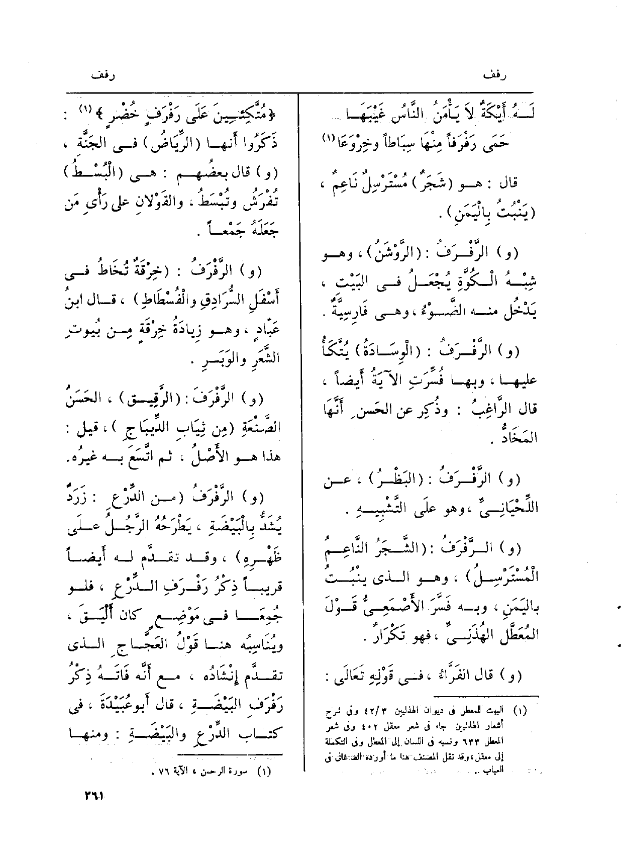 الهُذَلِيِّ، فَهُوَ تَكْرَارٌ. قَالَ الفَرَّاءُ، فِي قَوْلِهِ تَعَالَى:) مُتَّكِئِينَ عَلَى} رَفْرَفٍ خُضْرٍ) : ذَكَرُوا أَنها الرِّيَاضُ فِي الجَنَّةِ، قَالَ بعضُهم: هِيَ الْبُسْطُ تُفْرَشُ وتُبْسَطُ، والقَوْلانِ على رَأْيِ مَن جَعلَهُ جَمْعاً. الرَّفْرَفُ: خِرْقَةٌ تُخَاطُ فِي أَسْفَلِ السُّرَادِقِ والْفُسْطَاطِ، قَالَ بنُ عَبّادٍ، وَهُوَ زِيادَةُ خِرْقَةٍ مِن بُيوتِ الشَّعَرِ والوَبَرِ. الرَّفْرَفَ: الرَّقِيق، الحَسَنُ الصَّنْعَةِ مِن ثِيَابِ الدِّيبَاجِ، قيل: هَذَا هُوَ الأَصْلُ، ثمَّ اتَّسَعَ بِهِ غيرُه. الرَّفْرَفُ من الدِّرْعِ: زَرَدٌ يُشَدُّ بِالْبَيْضَةِ، يَطْرَحُهُ الرَّجُلُ علَى ظَهْرِهِ، وَقد تقدَّم لَهُ أَيضاً قَرِيبا ذِكْرُ رَفْرَفِ الدِّرْعِ، فَلَو جُمِعَا فِي مَوْضِعٍ كَانَ أَلْيَقَ، ويُنَاسِبُه هُنَا قَوْلُ العَجَّاجِ الَّذِي تقدَّم إِنْشَادُه، مَعَ أَنَّه فَاتَهُ ذِكْرُ رَفْرَفِ البَيْضَةِ، قَالَ أَبو عُبَيْدَةَ، فِي كتاب الدِّرْعِ والبَيْضَةِ: وَمِنْهَا
