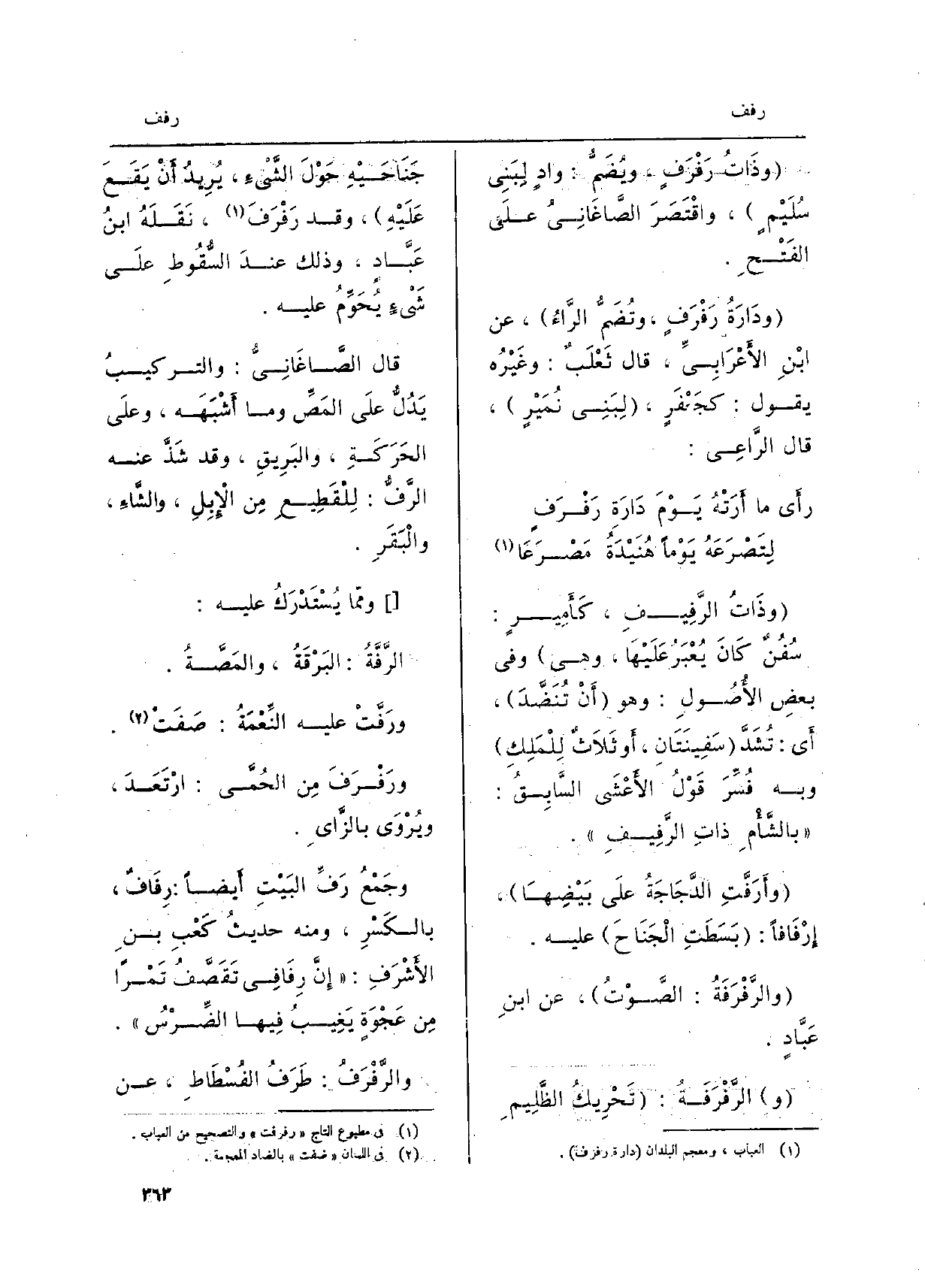 وذَاتُ الرَّفِيفِ، كَأَمِيرٍ: سُفُنٌ كَانَ يُعْبَرُ عَلَيْهَا، وَهِي وَفِي بعضِ الأُصُولِ: وَهُوَ أَنْ تُنَضَّدَ، أَي: تُشَدَّ سَفِينَتَانِ، أَو ثَلاَثٌ لِلْمَلِكِ وَبِه فُسِّرَ قَوْلُ الأَعْشَى السَّابِقُ: بالشَّأْمِ ذاتِ الرَّفِيفِ.} وأَرَفَّتِ)