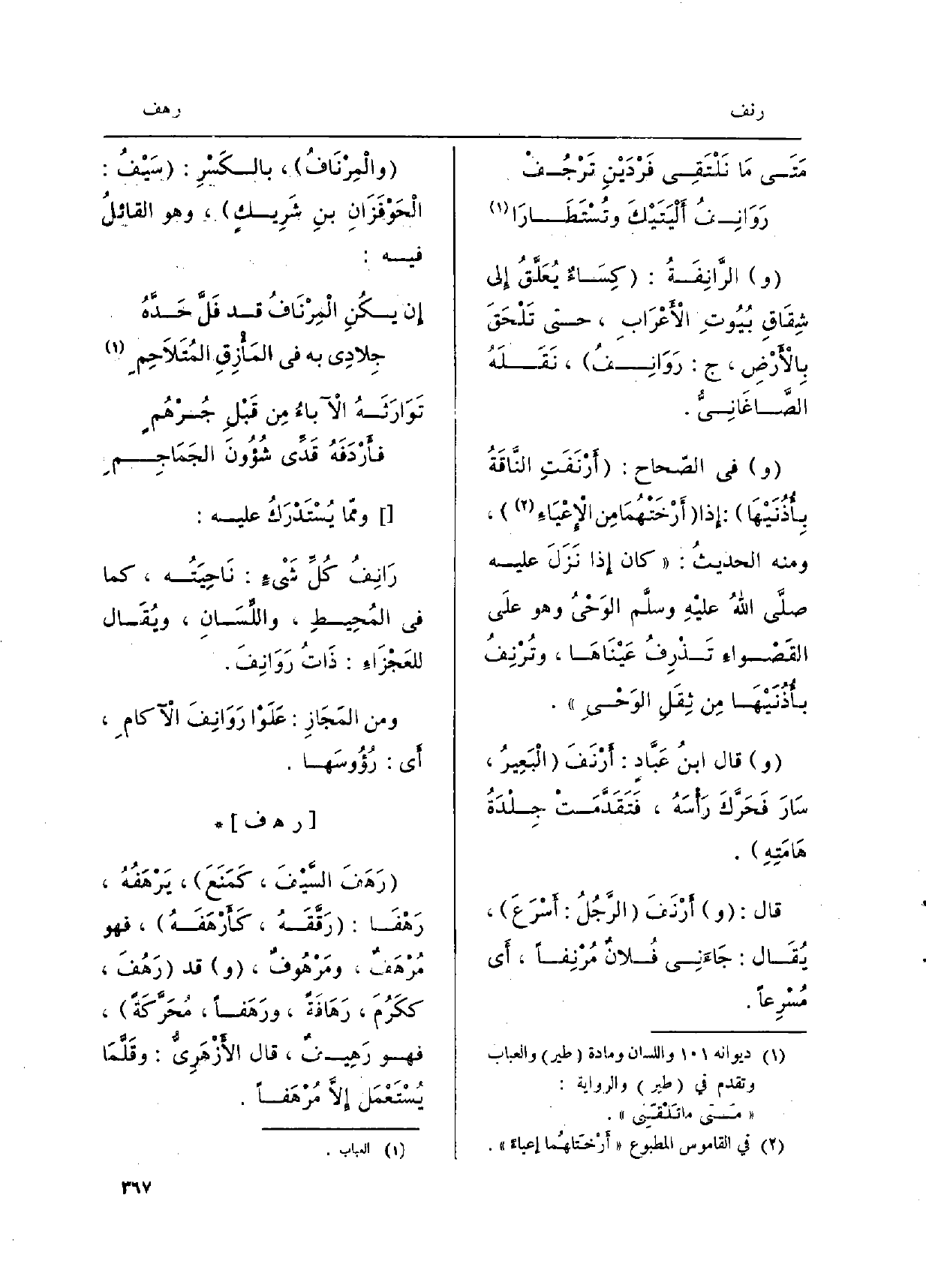الرَّانِفَةُ: كِسَاءٌ يُعَلَّقُ إِلى شِقَاقِ بُيُوتِ الأَعْرَابِ، حَتَّى تَلْحَقَ بِالأَرْضِ، ج: رَوَانِفُ، نَقَلَهُ الصَّاغَانِيُّ. فِي الصّحاح: أَرْنَفَتِ النَّاقَةُ بِأُذُنَيْهَا: إِذا أَرْخَتْهُمَا مِن الإِعْيَاءِ، وَمِنْه الحديثُ:) كَانَ إِذا نَزَلَ عَلَيْهِ صلى اللهُ عليْهِ وسلَّم الوَحْيُ وَهُوَ علَى القَصْواءِ تَذْرِفُ عَيْنَاهَا، وتُرْنِفُ بأُذُنَيْهَا مِن ثِقِلِ الوَحْيِ (. قَالَ ابنُ عَبَّادٍ: أَرْنَفَ الْبَعِيرُ، سَارَ فَحَرَّكَ رَأْسَهُ، فَتَقَدَّمَتْ جِلْدَةُ هَامَتِهِ. قَالَ: أَرْنَفَ الرَّجُلُ: أَسْرَعَ، يُقَال: جَاءَنِي فُلانٌ مُرْنِفاً، أَي مُسْرِعاً. والْمِرْنَافُ، بالكَسْرِ: سَيْفُ: الْحَوْفَزَانِ بنِ شَرِيكٍ، وَهُوَ القائلُ فِيهِ:)