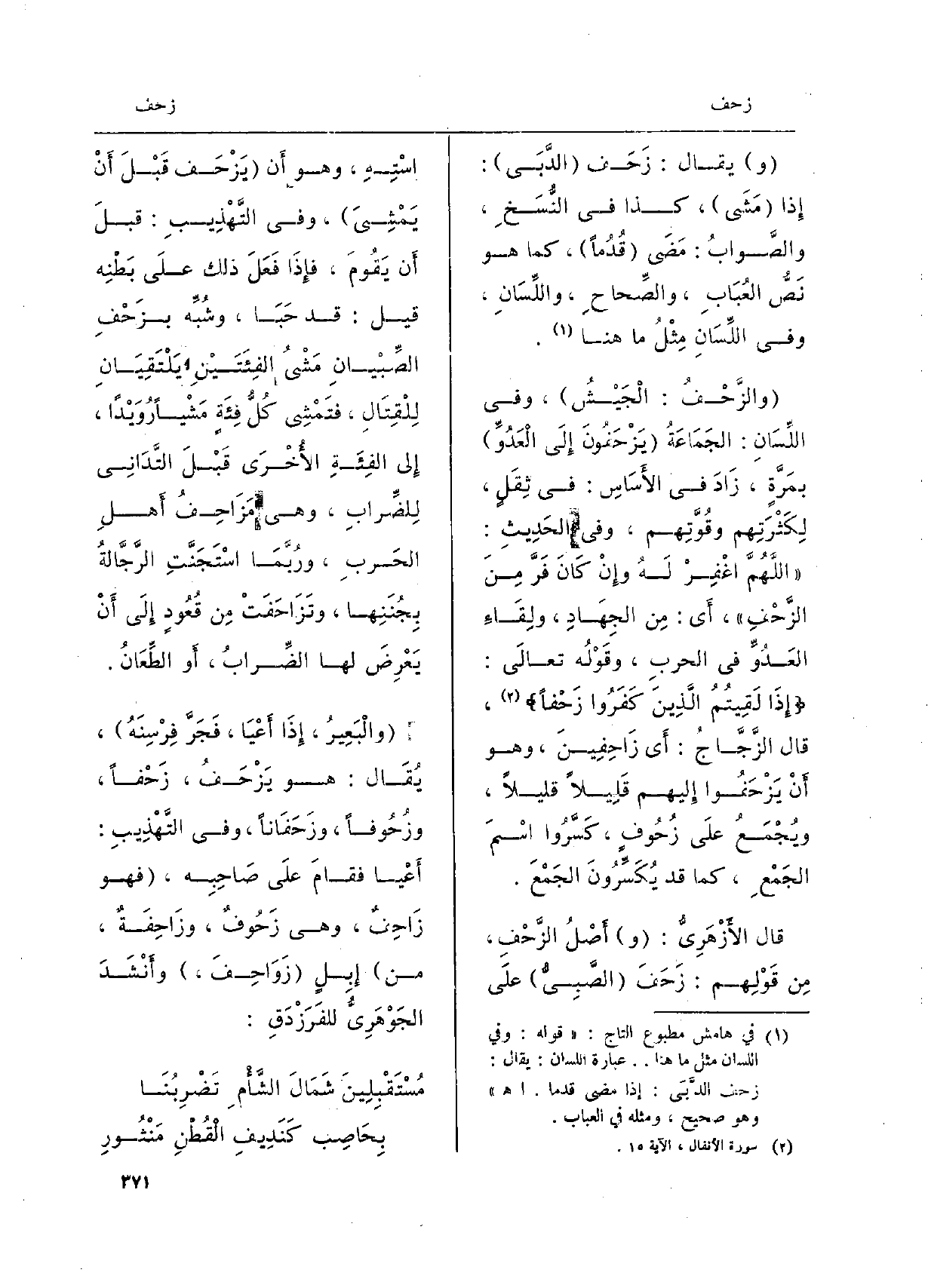 يُقَال: زَحَفَ الدَّبَى: إِذا مَشَى، كَذَا فِي النُّسَخِ، والصَّوابُ: مَضَى قُدُماً، كَمَا هُوَ نَصُّ العُبَابِ، والصِّحاحِ، واللِّسَانِ، وَفِي اللِّسَانِ مِثْلُ مَا هُنَا. والزَّحْفُ: الْجَيْشُ، وَفِي اللِّسَانِ: الجَمَاعَةُ يَزْحَفُونَ إِلَى الْعَدُوِّ بمَرَّةٍ، زَادَ فِي الأَسَاسِ: فِي ثِقَلٍ، لِكَثْرَتِهِم وقُوَّتِهم، وَفِي الحَدِيثِ:) اللَّهُمَّ اغْفِرْ لَهُ وإِنْ كَانَ فَرَّ مِنَ الزَّحْفِ (، أَي: مِن الجِهَادِ، ولِقَاءِ العَدُوِّ فِي الحربِ، وقَوْلُه تعالَى:) إِذَا لَقِيتُمُ الَّذِينَ كَفَرُوا زَحْفَاً (، قَالَ الزَّجَّاجُ: أَي زَاحِفِينَ، وَهُوَ أَنْ يَزْحَفُوا إِليهم قَلِيلاً قَلِيلا، ويُجْمَعُ علَى زُحُوفٍ، كَسَّرُوا اسْمَ الجَمْعِ، كَمَا قد يُكَسِّرُونَ الجَمْعِ. قَالَ الأَزْهَرِيُّ: أَصْلُ الزَّحْفِ، مِن قَوْلِهم: زَحَفَ الصَّبِيُّ علَى اسْتِهِ، وَهُوَ أَن يَزْحَف قَبْلَ أَنْ يَمْشِيَ، وَفِي التَّهْذِيبِ: قبلَ أَن يَقُومُ، فإِذَا فَعَلَ ذَلِك علَى بَطْنِهِ قيل: قد حَبَا، وشُبِّه بزَحْفِ الصِّبْيانِ مَشْىُ الفِئَتَيْنِ يَلْتَقِيَانِ لِلْقِتَالِ، فتَمْشِي كُلُّ فِئَةٍ مَشْياً رُوَيْداً، إِلى الفِئَةِ الأُخْرَى قَبْلَ التَّدَانِي لِلضَّرابِ، وَهِي مَزَاحِفُ أَهلِ الحَربِ، ورُبَّمَا اسْتَجَنَّتِ الرَّجَّالةُ بِجُنَنِها، وتَزَاحَفَتْ مِن قُعُودٍ إِلَى أَنْ يَعْرِضَ لَهَا الضَّرابُ، أَو الطِّعَانُ. والْبَعِيرُ، إِذا أَعْيَا، فَجَرَّ فِرْسِنَهُ، يُقَال: هُوَ يَزْحَفُ، زَحْفاً، وزُحُوفاً، وزَحَفَاناً، وَفِي التَّهْذِيبِ: أَعْيَا فقامَ علَى صَاحِبِه، وزَاحِفَةٌ، من إِبِلٍ زَوَاحِفَ، وأَنْشَدَ الجَوْهَرِيُّ للفَرَزْدَقِ: