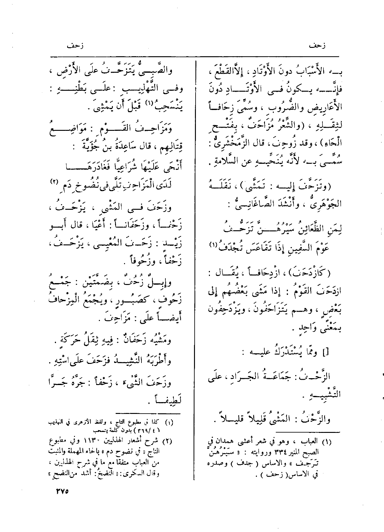 كَازْدَحَفَ، ازْدِحَافاً، يُقَال: ازدَحَفَ القَوْمُ: إِذا مَشَى بَعْضُهُم إِلى بَعْضٍ، وهم يَتَزَاحَفُونَ، ويَزْدَحِفُون بمَعْنَىً وَاحِدٍ. وممّا يُسْتَدْرَكُ عَلَيْهِ: الزَّحْفُ: جَمَاعَةُ الجَرَادِ، علَى التَّشْبِيهِ. والزَّحْفُ: المَشْيُ قَلِيلاً قَلِيلا. والصَّبِيُّ يَتَزَحَّفُ علَى الأَرْضِ، وَفِي التَّهْذِيبِ: علَى بَطْنِهِ: يَنْسَحِبُ قَبْلَ أَن) يَمْشِىَ. وَمَزَاحِفُ القَوْمِ: مَوَاضِعُ قِتَالِهِم، قَالَ سَاعِدَةُ بنُ جُؤَيَّةَ: