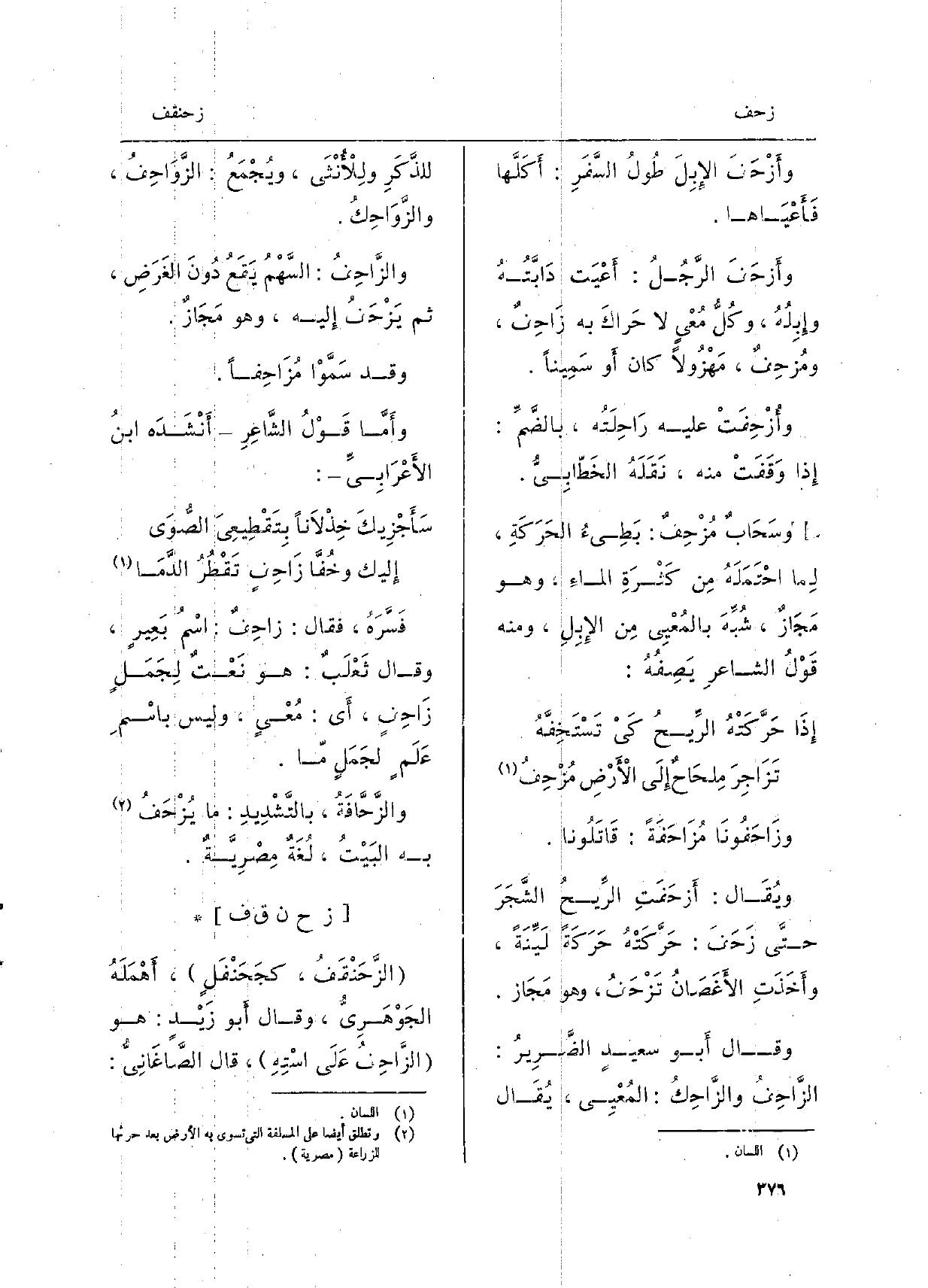 فَسَّرَهُ، فَقَالَ: زاحِفٌ: اسْمٌ بَعِيرٍ، وَقَالَ ثَعْلَبٌ: هُوَ نَعْتٌ لِجَمَلٍ زَاحِفٍ، أَي: مُعْيٍ، وَلَيْسَ باسْمِ عَلَمٍ لجَمَلٍ مّا. والزَّحَّافَةُ، بالتَّشْدِيدِ: مَا يُزْحَفُ بِهِ البَيْتُ، لُغَةٌ مَصْرِيَّةٌ.