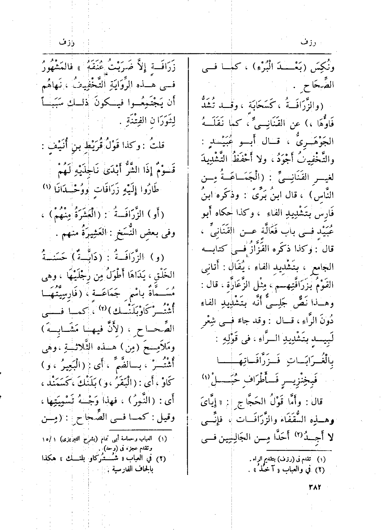 قَالَ: وأَمَّا قَوْلُ الحَجَّاجِ: إِيَّايَ وهذِه السُّقَفَاء والزَّرَافَات، فإِنِّي لَا أَجِدُ أَحَدَاً مِن الجَالِسِين فِي زرَافَةٍ إِلاَّ ضَرَبْتُ عُنَقَهُ فالمَشْهُورُ فِي هَذِه الرِّوَايَة التَّخْفِيفُ، نَهاهُم أَن يَجْتَمِعُوا فيكونَ ذَلِك سَبَباً لِثَوَرَانِ الفِتْنَةِ. قلتُ: وَكَذَا قَوْلُ قُرَيْطِ بنِ أُنَيْفٍ:)
