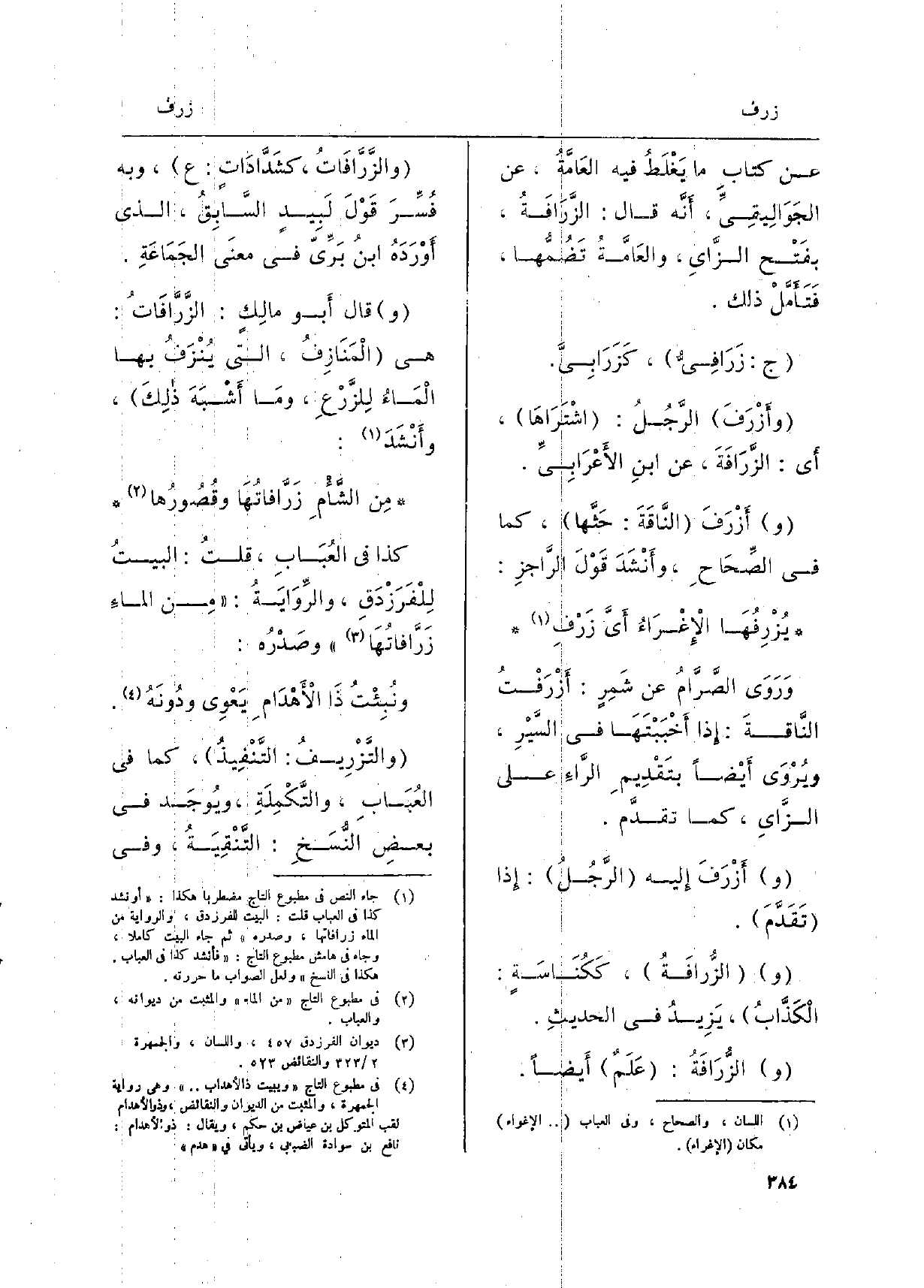 الزُّرَافَةُ: عَلَمٌ أَيضاً. والزَّرَّفَاتُ، كشَدَّدَاتٍ: ع، وَبِه فُسِّرَ قَوْلَ لَبِيدٍ السَّابِقُ، الَّذِي أَوْرَدَهُ ابنُ بَرِّيّ فِي معنَى الجَمَاعِةِ. قَالَ أَبو مالِكٍ: الزَّرَّافَاتُ: هِيَ الْمَنَازِفُ، الَّتِي يُنْزَفُ بهَا الْمَاءُ لِلزَّرْعِ، ومَا أَشْبَهَ ذلِكَ، وأَنْشَدَ: مِن الشَّأْمِ زَرَّافاتُهَا وقُصُورُها كَذَا فِي العُبَابِ، قلتُ: البيتُ لِلْفَرَزْدَقِ، والرِّوَايَةُ: مِن الماءِ زَرَّافاتُهَا وصَدْرُه: ونُبِئْتُ ذَا الأَهْدَامِ يَعْوِي ودُونَهُ.