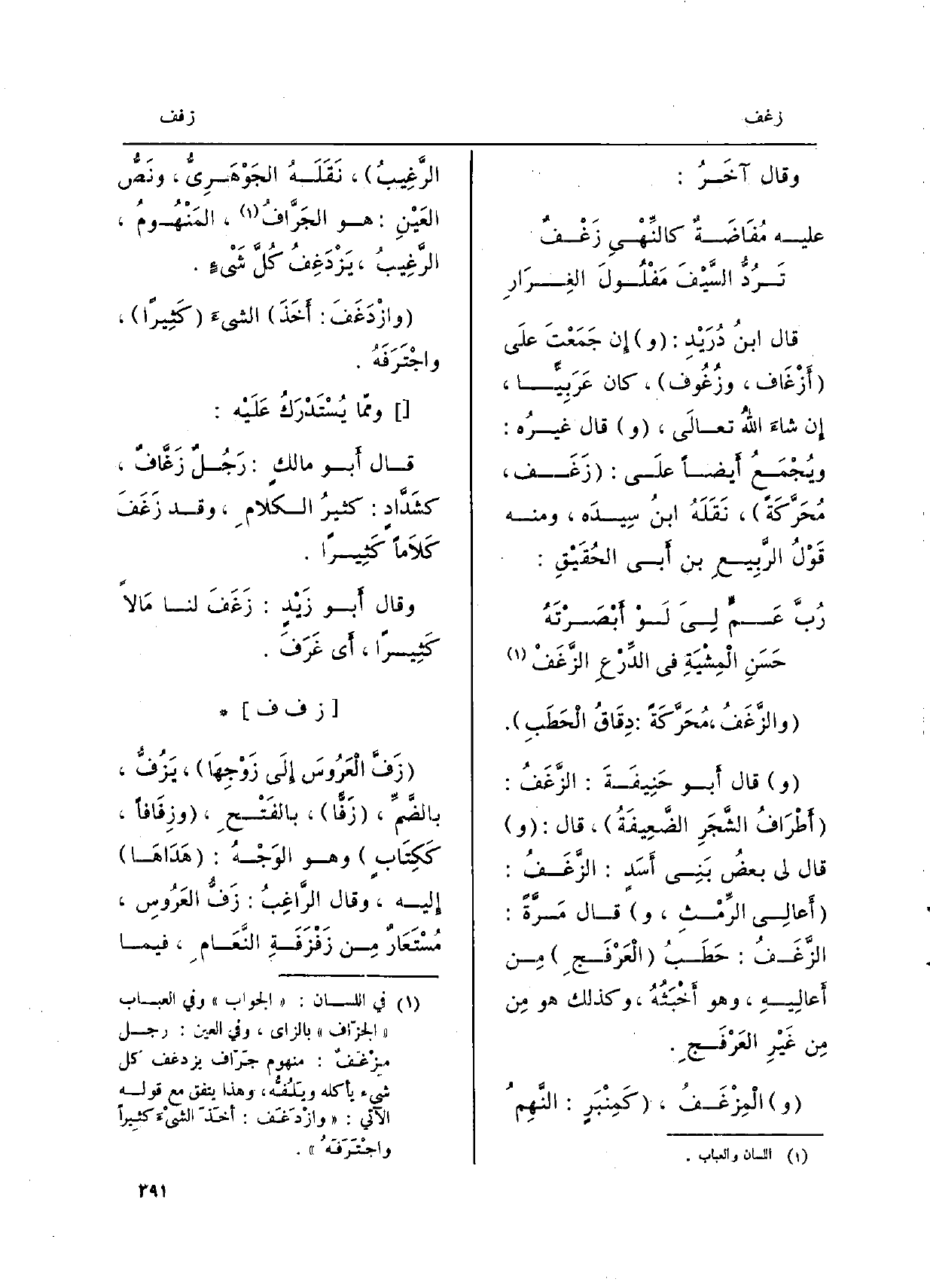 والزَّغَفُ، مُحَرَّكَةً: دِقَاقُ الْحَطَبِ. قَالَ أَبو حَنِيفَةَ: الزَّغَفُ: أَطْرَافُ الشَّجَرِ الضَّعِيفَةُ، قَالَ: قَالَ لي بعضُ بَنِي أَسَدٍ: الزَّغَفُ: أَعالِي الرِّمْثِ، وَقَالَ مَرَّةً: الزَّغَفُ: حَطَبُ الْعَرْفَج مِن أَعالِيهِ، وَهُوَ أَخْبَثُهُ، وَكَذَلِكَ هُوَ مِن مِن غَيْرِ العَرْفَجِ. الْمِزْغَفُ، كَمِنْبَرٍ: النَّهِمُ الرَّغِيبُ، نَقَلَهُ الجَوْهَرِيُّ، ونَصُّ العَيْنِ: هُوَ الجَرَّافُ، المَنْهُومُ، الرَّغِيبُ، يَزْدَعِفُ كُلَّ شَيْءٍ. وازْدَغَفَ: أَخَذَ الشيءِ كَثِيراً، واجْتَرَفَهُ. وممّا يُسْتَدْرَكُ عَلَيْه: قَالَ أَبو مالكٍ: رَجُلٌ زَغَّافٌ، كشَدَّادٍ: كثيرُ الكلامِ، وَقد زَغَفَ كَلاَماً كَثِيراً. وَقَالَ أَبو زَيْدٍ: زَغَفَ لنا مَالاً كَثِيراً، أَي غَرَفَ.