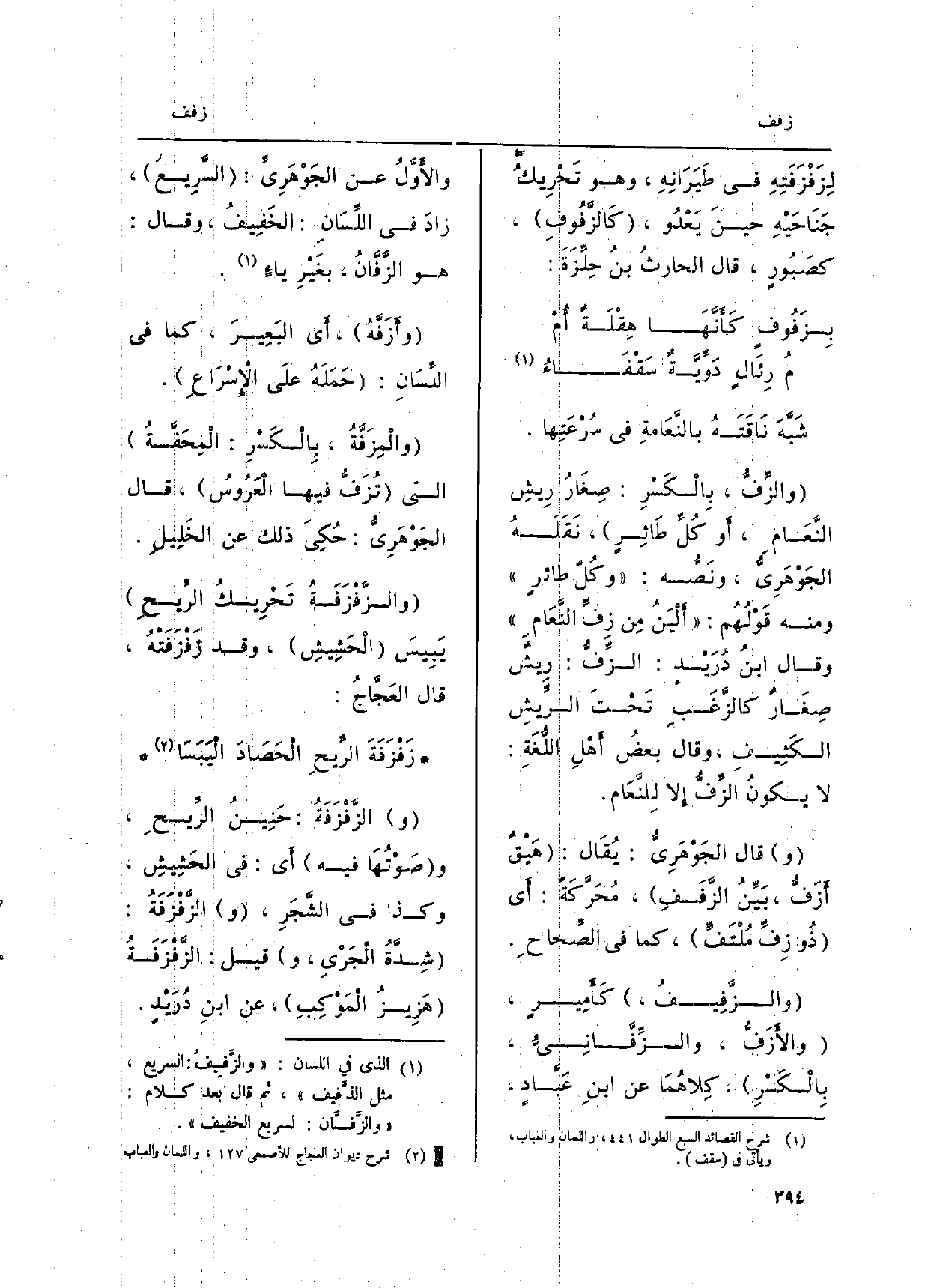 {لِزَفْزَفَتِهِ فِي طَيَرَانِهِ، وَهُوَ تَحْرِيكُ جَنَاحَيْهِ حينَ يَعْدُ،} كَالزَّفُوفِ، كصَبُورٍ، قَالَ الحارثُ بنُ حِلَّزَةَ: