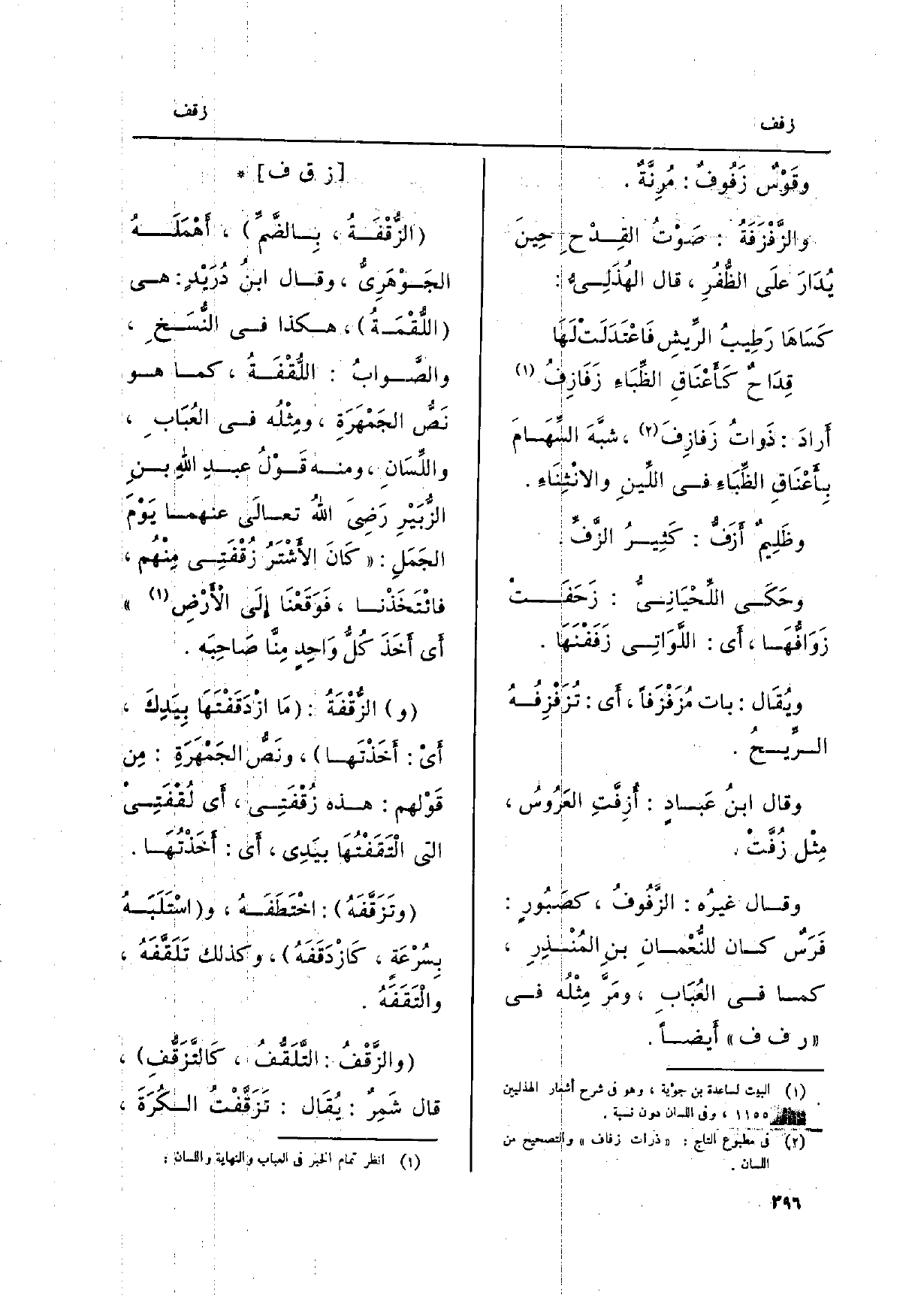 أَرَادَ: ذَواتُ زَفازِفَ، شبَّهَ السَّهَامَ بِأَعْنَاقِ الظِّبَاءِ فِي اللِّينِ والانْثِنَاءِ. وظَلِيمٌ {أَزَفُّ: كَثِيرُ الزَّفِّ.