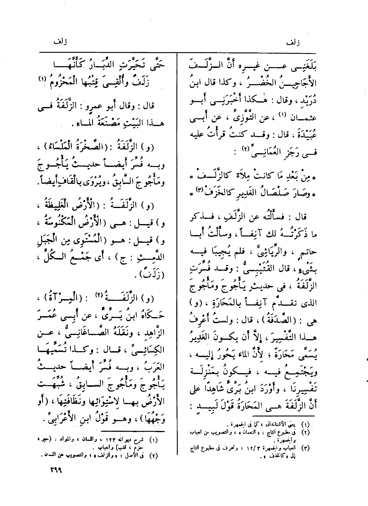 قَالَ: وَقَالَ أَبو عمرٍ و: الزَّلَفَةُ فِي هَذَا البَيْتِ مَصْنَعَةُ الماءِ. الزَّلَفَةُ: الصَّخْرَةُ الْمَلْسَاءُ، وَبِه فُسِّرَ أَيضاً حديثُ يَأْجُوجَ ومَأْجُوجَ السَّابِقُ، ويُرْوَى بالْقَافِ أَيضاً. الزَّلَفَةُ: الأَرْضُ الْغَلِيظَةُ، قيل: هِيَ الأَرْضُ الْمَكْنُوسَةُ، قيل: هُوَ الْمُسْتَوِي مِن الْجَبَلِ الدَّمِثِ:، أَي جَمْعُ الكُلِّ، زَلَفٌ. الزَّلَفَةُ: الْمِرْآةُ، حَكَاهُ ابنُ بَرِّيٍّ، عَن أَبِي عُمَرَ الزَّاهِدِ، ونَقَلَهُ الصَّاغَانِيُّ، عَن الكِسَائِيِّ، قَالَ: وَكَذَا تُسَمِّيهَا العَرَبُ، وَبِه فُسِّرَ أَيضاً حديثُ يَأْجُوجَ ومَأْجُوجَ السابِقُ، شُبِّهَت الأَرْضُ بهَا لاِسْتِوَائِها ونَظَافَتِهَا، أَو وَجْهُهَا، وَهُوَ قَوْلُ ابنِ الأَعْرَابِيِّ.