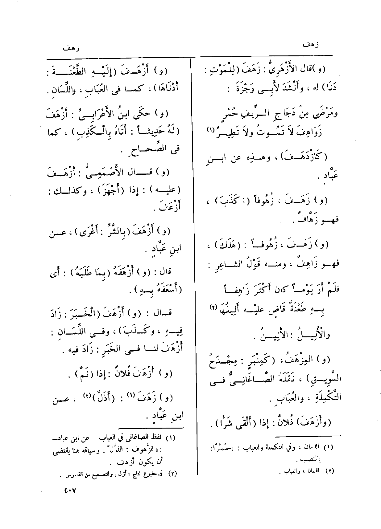 كَازْدَهَفَ، وهذِه عَن ابنِ عَبَّادٍ. زَهَفَ، زُهُوفَاً: كَذَبَ، فَهُوَ زَهَّافٌ. زَهَفَ، زُهُوفاً: هَلَكَ، فَهُوَ زَاهِفٌ، وَمِنْه قَوْلُ الشَّاعِرِ: