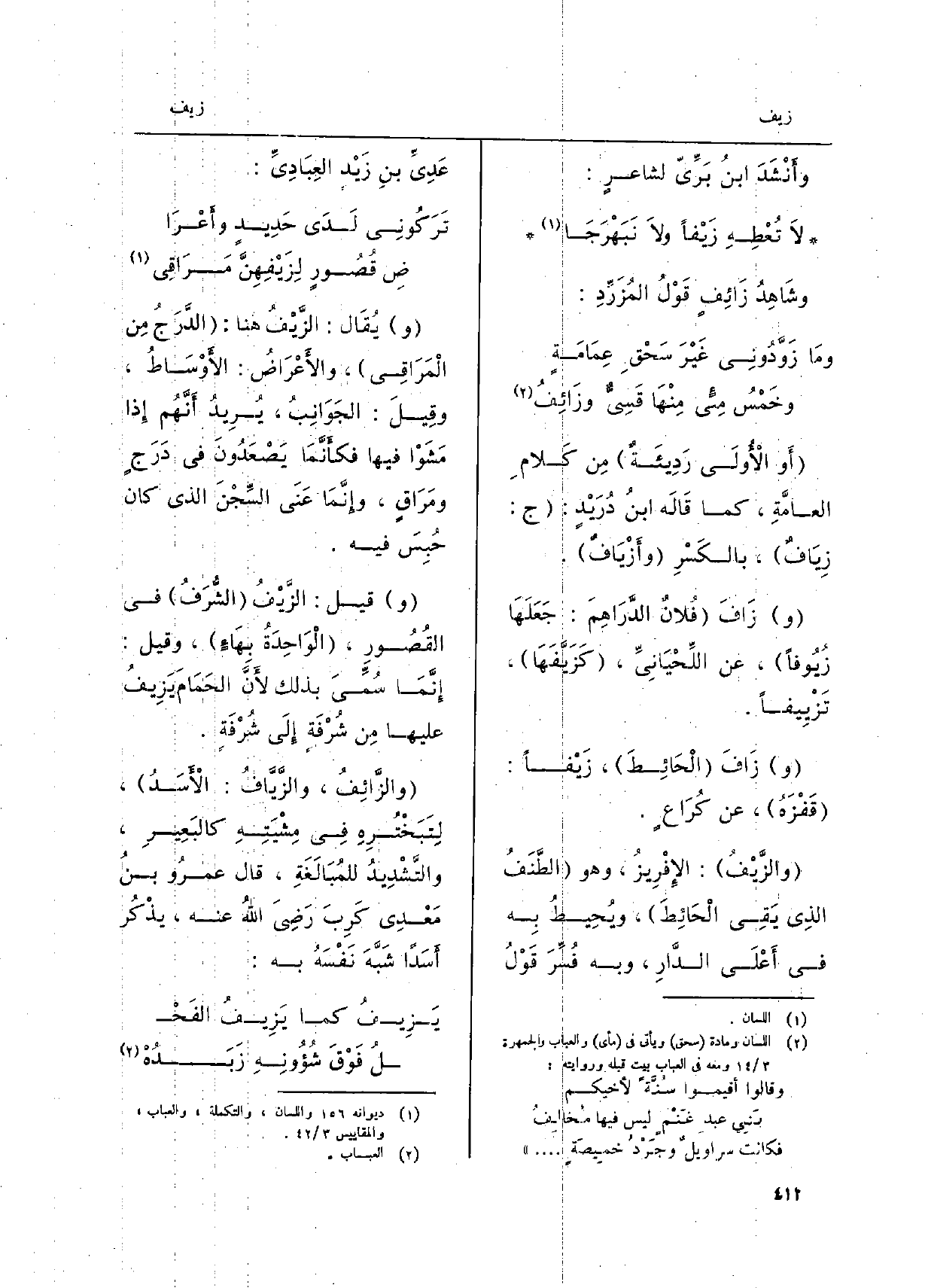 } والزَّيْفُ: الإِفْرِيزُ، وَهُوَ الطَّنَفُ الذِي يَقِي الْحَائِطَ، ويُحِيطُ بِهِ فِي اَعْلَى الدَّارِ، وَبِه فُسِّرَ قَوْلُ عَدِيِّ بنِ زَيْد العِبَادِيِّ: