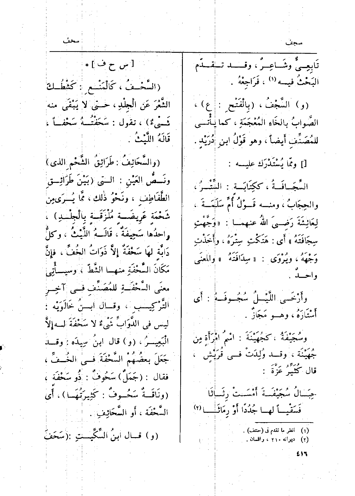 السَّحْفُ، كَالْمَنْعِ: كِشْطُك الشَّعْرَ عَن الجِلْدِ، حَتَّى لَا يَبْقَى مِنْهُ شَيْءٌ، تَقول: سَحَفْتُهُ سَحْفاً، قَالَهُ اللُّيْثُ. والسَّحَائِفُ: طَرَائِقُ الشَّحْمِ الَّذِي ونَصُّ العَيْنِ: الَّتِي بَيْنَ طَرَائِقِ الطَّفَاطِفِ، ونَحْوُ ذَلِك، ممَّا يُرَى مِن شَحْمَةٍ عَرِيضَةٍ مُلْزَقَةٍ بِالْجِلْدِ، واحدُها سَحِيفَةٌ، قَالَهُ اللَّيْثُ، وكلُّ دَابَّةٍ لَها سَحْفَةٌ إِلاَّ ذَوَاتُ الخُفِّ، فإِنَّ مَكَانَ السَّحْفَةِ مِنْهَا الشَّطّ، وسيأْتِي معنَى السَّحْفَةِ للمُصَنِّفِ فِي آخِرِ التَّرْكِيبِ، وَقَالَ ابنُ خَالَوَيْه: لَيْسَ فِي الدَّوَابِّ شَيءٌ لَا سَحْفَةَ لَهُ إِلاَّ الْبَعِيرُ، قَالَ ابنُ سِيدَه: وَقد جَعَلَ بعضُهُمْ السَّحْفَةَ فِي الخُفِّ، فَقَالَ: جَمَلٌ سَحُوفٌ: ذُو سَحْفَةٍ، ونَاقَةٌ سَحُوفٌ: كَثِيرَتُهَا، أَي السَّحْفَة، أَو السَّحَائِفِ. قَالَ ابنُ السِّكِّيتِ: سَحَفَ