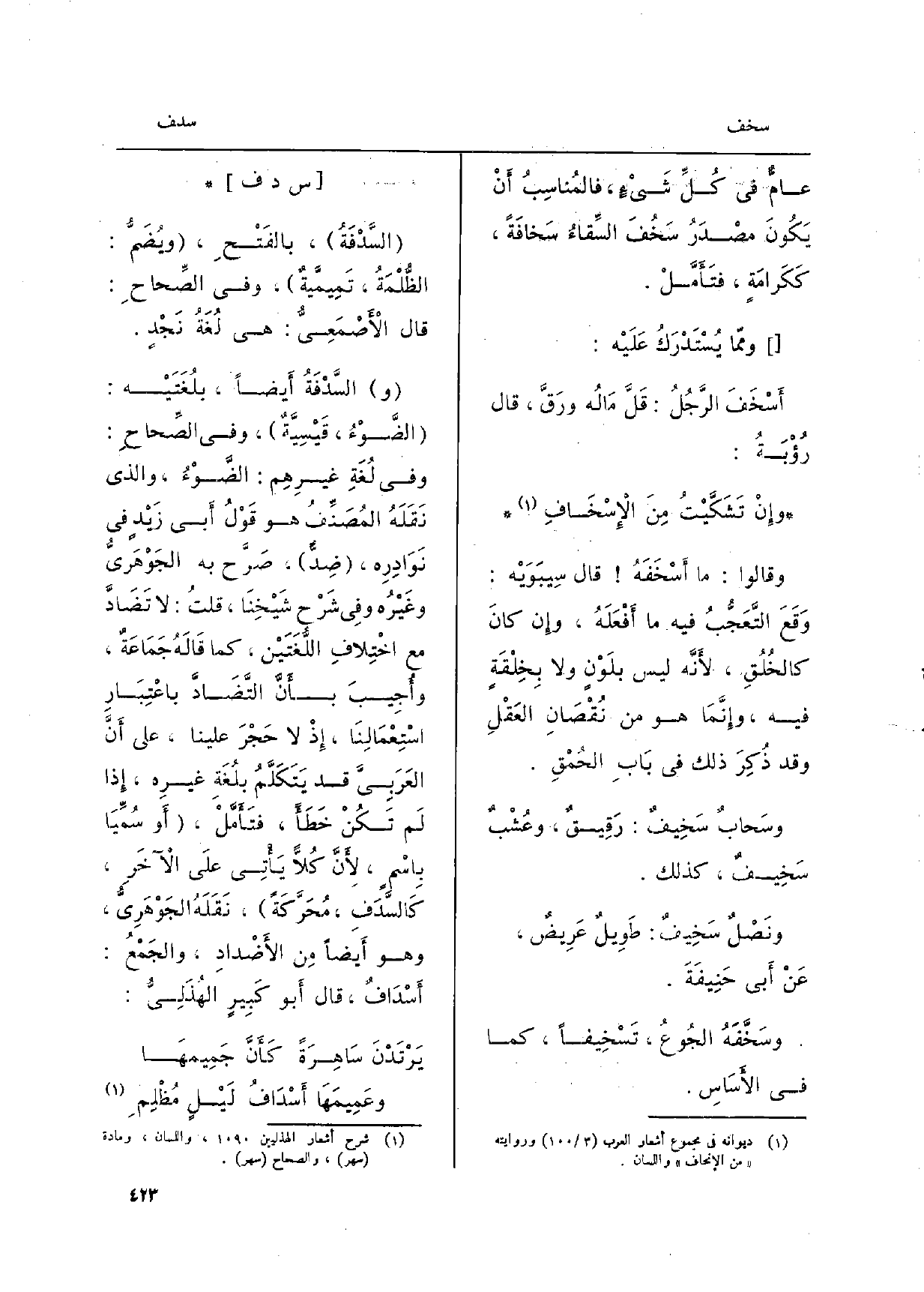 السَّدْفَةُ: بالفَتْحِ، ويُضَمُّ الظُّلْمَةُ، تَمِيمَّيةٌ، وَفِي الصَّحاحِ: قَالَ الأَصْمَعِيُّ: هِيَ لُغَةُ نَجْدٍ: السَّدْفَةُ أَيْضا، بلُغَتَيْه: الضَّوْءُ، قَيْسِيَّةٌ، وَفِي الصِّحاحِ: وَفِي لُغَةِ غيرِهِم: الضَّوْءُ، وَالَّذِي نَقَلَهُ المُصَنِّفُ هُوَ قَوْلُ أبي زَيْدٍ فِي نَوَادِرِه، ضِدٌّ، صَرَّح بِهِ الجَوْهَريُّ وغَيْرُه وفِي شَرْح شَيْخِنَا، قلتُ: لَا تَضَادَّ مَعَ اخْتِلافِ اللُّغَتَيْن، كَمَا قَالَهُ جَمَاعَةٌ، وأُجِيبَ بأنَّ التَّضَادَّ باعْتِبَارِ اسْتِعْمَالِنَا، إذْ لَا حَجْرَ علينا، على أنَّ العَرَبِيَّ قد يَتَكَلَّمُ بلُغَةِ غيرِه، إِذا لَم تَكُنْ خَطَأً، فتَأَمَّلْ، أَو سُمِّيَا بِاسْمٍ، لأَنَّ كُلاًّ يَأْتِي علَى الآْخَرِ، كَالسَّدَفِ، مُحَرَّكَةً، نَقَلَهُ الجَوْهَرِيُّ وَهُوَ أَيْضا مِن الأَضْدادِ، والجَمْعُ: أسْدَافٌ، قَالَ أَبُو كَبِيرٍ الهُذَلِيُّ: