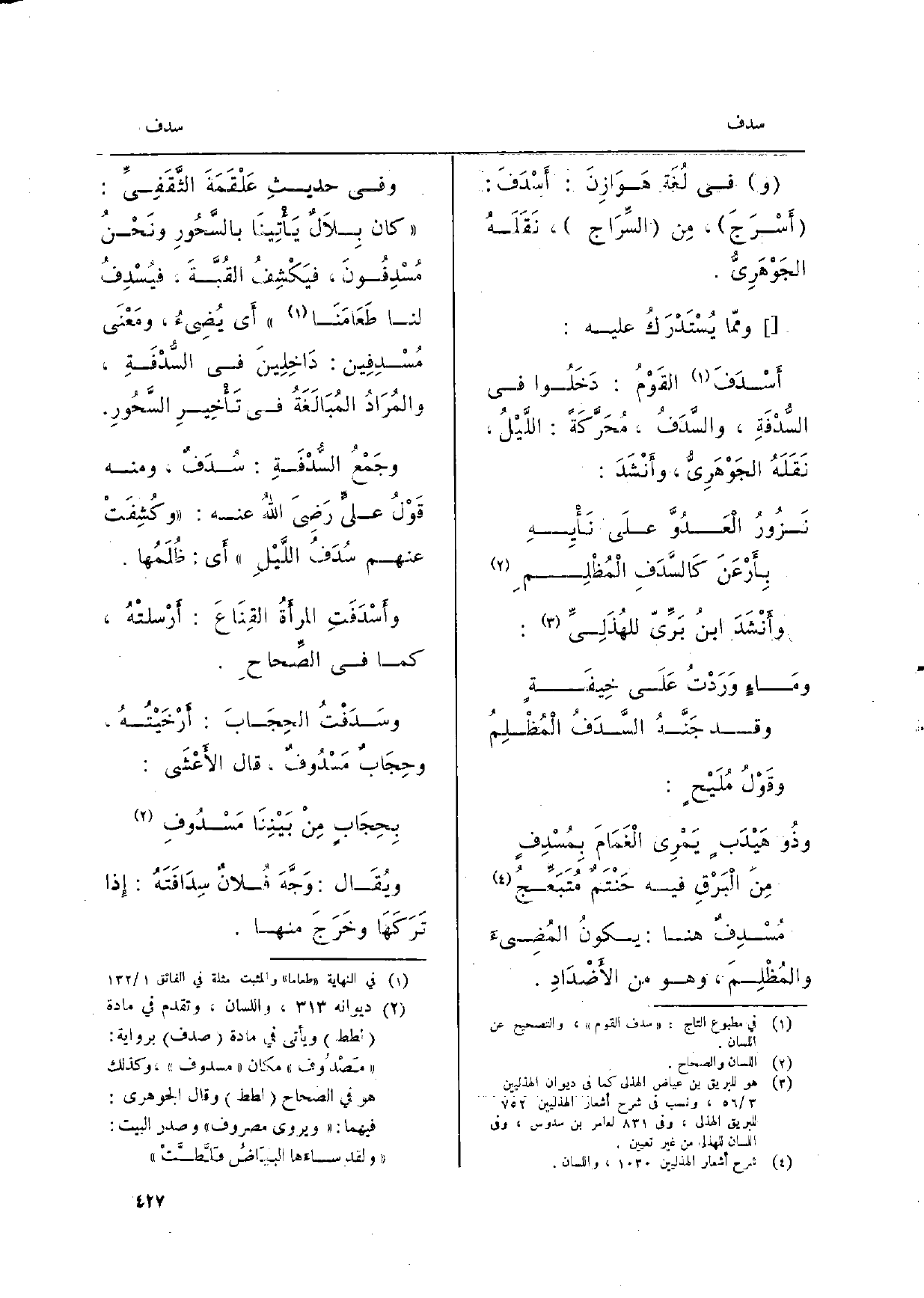 وَفِي حديثِ عَلْقَمَةَ الثَّقَفِيِّ: كَانَ بِلاَلٌ يَأْتِينَا بالسَّحُورِ ونَحْنُ مُسْدِفُونَ، فيَكْشِفُ القُبَّةَ، فيُسْدِفُ لنا طَعَامَنَا أَي يُضِيءُ، ومَعْنَى مُسْدِفِين: دَاخِلِين فِي السُّدْفَةِ، والمُرَادُ المُبَالَغَةُ فِي تَأْخِيرِ السَّحُورِ. وجَمْعُ السُّدْفَةِ: سُدَفٌ، وَمِنْه قَوْلُ علىٍّ رَضِىَ اللهُ عَنهُ: وكُشِفَتْ عَنْهُم سُدَفُ اللَّيْلِ أَي: ظُلَمُها. وأَسْدَفَتِ المرأَةُ القِنَاعَ: أَرْسلتْهُ، كَمَا فِي الصَّحاحِ.