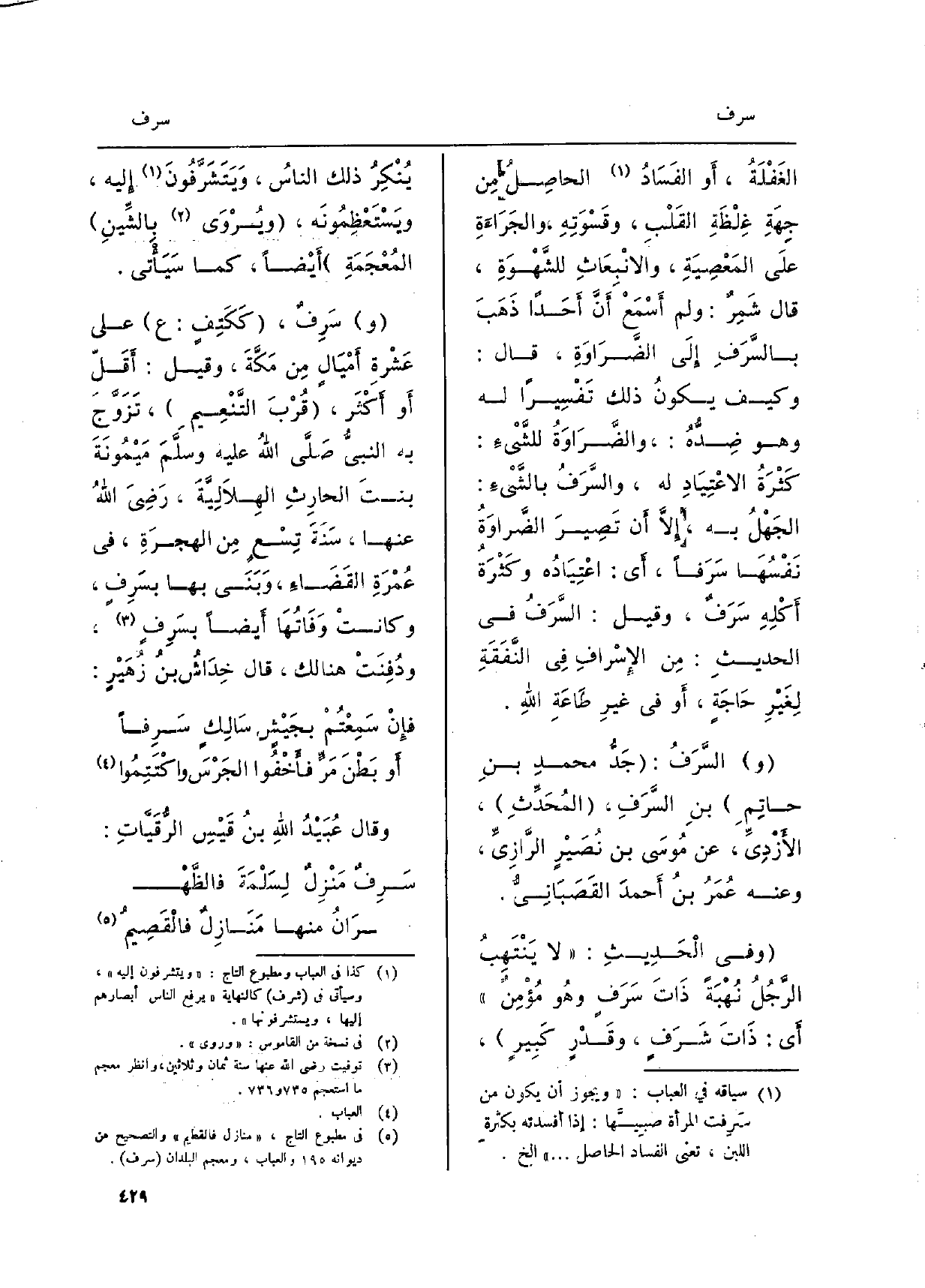 الغَفْلَةُ، أَو الفَسَادُ الحاصِلُ مِن جِهَةِ غِلْظَةِ القَلْبِ، وقَسْوَتِهِ، والجَرَاءَةِ علَى المَعْصِيَةِ، والانْبِعَاثِ للشَّهْوَةِ، قَالَ شَمِرٌ: وَلم أسْمَعْ أنَّ أَحَداً ذَهَبَ بالسَّرَفِ إِلَى الضَّرَاوَةِ، قَالَ: وَكَيف يكونُ ذَلِك تَفْسِيراً لَهُ وَهُوَ ضِدُّهُ، والضَّرَاوَةُ للشَّيءِ: كَثْرَةُ الاعْتِيَادِ لَهُ، والسَّرَفُ بالشَّيءِ: الجَهْلُ بِهِ، إِلاَّ أَن تَصِيرَ الضَّراوَةُ نَفْسُهَا سَرَفاً، أَي: اعْتِيادُه وكَثْرَةُ أَكْلِهِ سَرَفٌ، وَقيل: السَّرفُ فِي الحديثِ: مِن الإِسْرافِ فِي النَّفَقَةِ لِغَيْرِ حَاجَةٍ، أَو فِي غيرِ طَاعَةِ اللهِ: السَّرَفُ جَدُّ محمدِ بنِ حاتِمِ بنِ السَّرَفِ، المُحَدِّثِ، الأَزْدِيِّ، عَن مُوسَى بن نُصَيْرٍ الرَّازِيِّ، وَعنهُ عُمَرُ بنُ أَحمدَ القَصَبَانِيُّ. وَفِي الْحَدِيثِ:) لَا يَنْتَهِبُ الرَّجُلُ نُهْبَةً ذَاتَ سَرَفٍ وهُو مُؤْمِنٌ أَي: ذَاتَ شَرَفٍ، وقَدْرٍ كَبِيرٍ، يُنْكِرُ ذَلِك الناسُ، وَيَتَشَرَّفُونَ إِليه، ويَسْتَعْظِمُونَه، ويُرْوَى بِالشِّينِ المُعْجَمَةِ أَيْضاً، كَمَا سَيَأْتي.