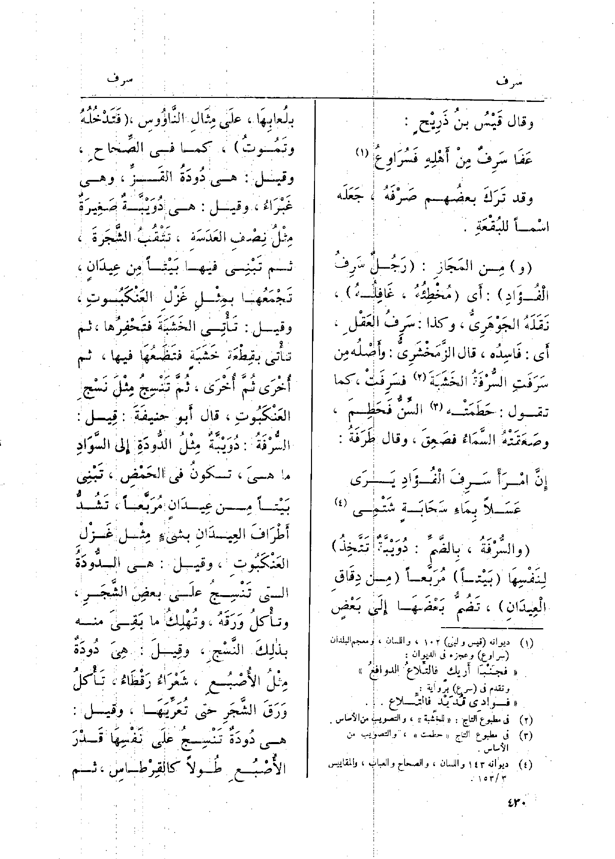 وَقَالَ قَيْسُ بنُ ذَرِيْحٍ: عَفَا سَرِفٌ مِنْ أَهْلِهِ فَسُرَاوِعُ وَقد تَرَكَ بعضُهم صَرْفَهُ، جَعَلَه اسْماً للبُقْعَةِ. مِن المَجَازِ: رَجُلٌ سَرِفُ الْفُؤَادِ: أَي مُخْطِئُهُ، غَافِلُهُ، نَقَلَهُ الجَوْهَرِيُّ، وَكَذَا: سَرِفُ العَقْلِ، أَي: فَاسِدُه، قَالَ الزَّمَخْشَرِيُّ: وأَصْلُهِ مِن سَرَفَتِ السُّرْفَةُ الخَشَبَةَ فسَرِفَتْ، كَمَا تَقول: حَطَمَتْه السِّنُّ فَحَطِمَ، وصَعَقَتْهُ السَّمَاءُ فصَعِقَ، وَقَالَ طَرَفَةُ: