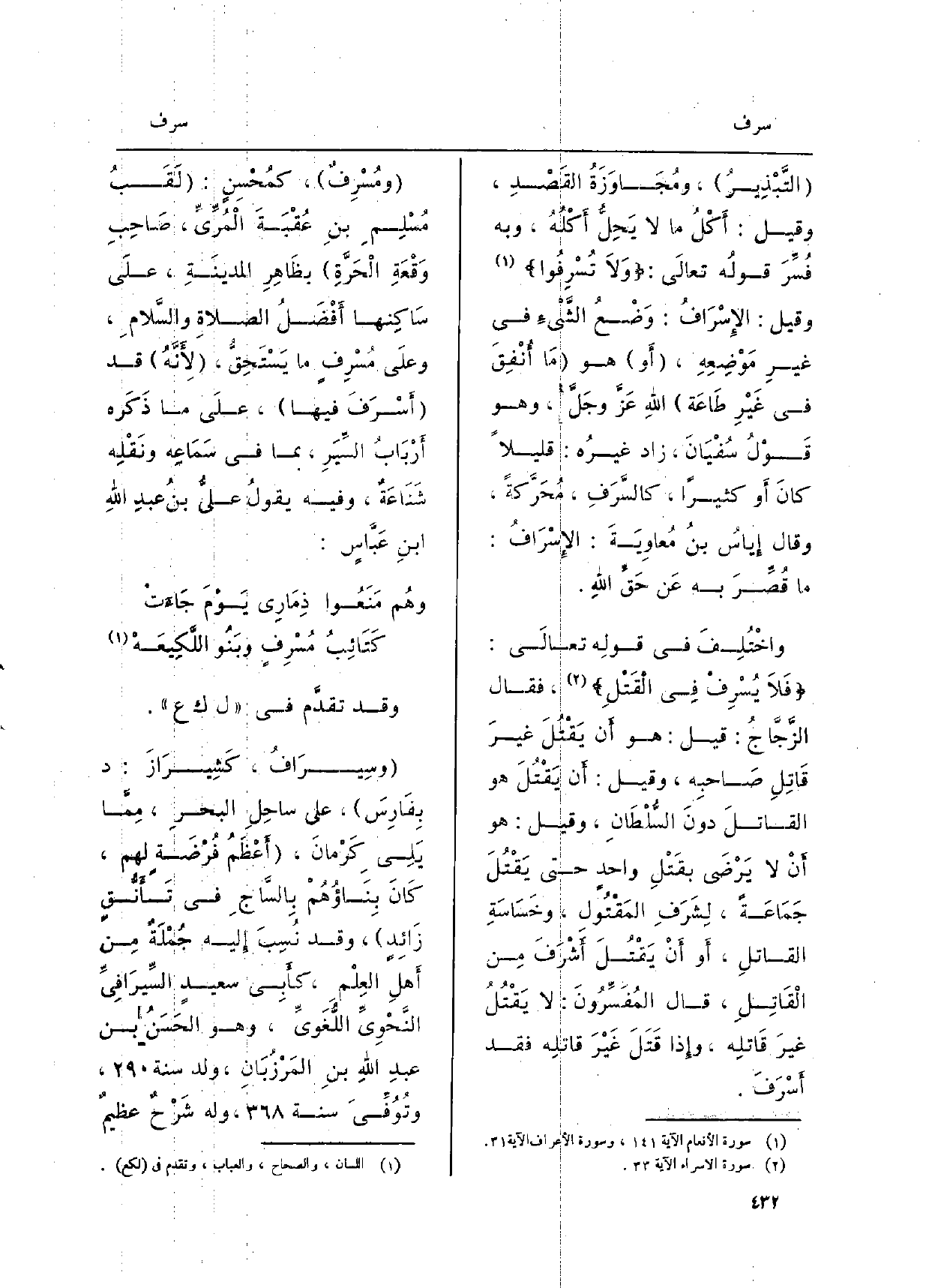 واخْتُلِفَ فِي قولِه تعالَى:) فَلاَ يُسْرِفْ فِي الْقَتْلِ (، فَقَالَ الزَّّجَّاجُ: قيل: هُوَ أَن يَقْتُلَ غيرَ قَاتِلِ صَاحبِه، وَقيل: أَن يَقْتُلَ هُوَ القاتلَ دونَ السُّلْطَانِ، وَقيل: هُوَ أَنْ لَا يَرْضَى بقَتْلِ واحدٍ حَتَّى يَقْتُلَ جَمَاعَةً، لِشَرَفِ المَقْتُولِ، وخَسَاسَةِ القاتلِ، أَو أَنْ يَقْتُلَ أَشْرَفَ مِن الْقَاتِلِ، قَالَ المُفَسِّرُونَ: لَا يَقْتُلُ غيرَ قَاتِله، وإِذا قَتَلَ غَيْرَ قاتِله فقد أَسْرَفَ. ومُسْرِفٌ كمُحْسِنٍ: لَقَبُ مُسْلِمِ بنِ عُقْبَةَ الْمُرِّىِّ، صَاحِبِ وَقْعَةِ الْحَرَّةِ بظَاهِرِ المدينَةِ، علَى سَاكِنها أَفْضَلُ الصلاةِ والسَّلامِ، وعلَى مُسْرِفٍ مَا يَسْتَحِقُّ، لأَنَّهُ قد أَسْرَفَ فِيهَا، علَى مَا ذَكَره أَرْبَابُ السِّيَرِ، بِمَا فِي سَمَاعِه ونَقْلِه شَنَاعَةٌ، وَفِيه يقولُ عليُّ بنُ عبدِ اللهِ ابنِ عَبَّاٍ س: