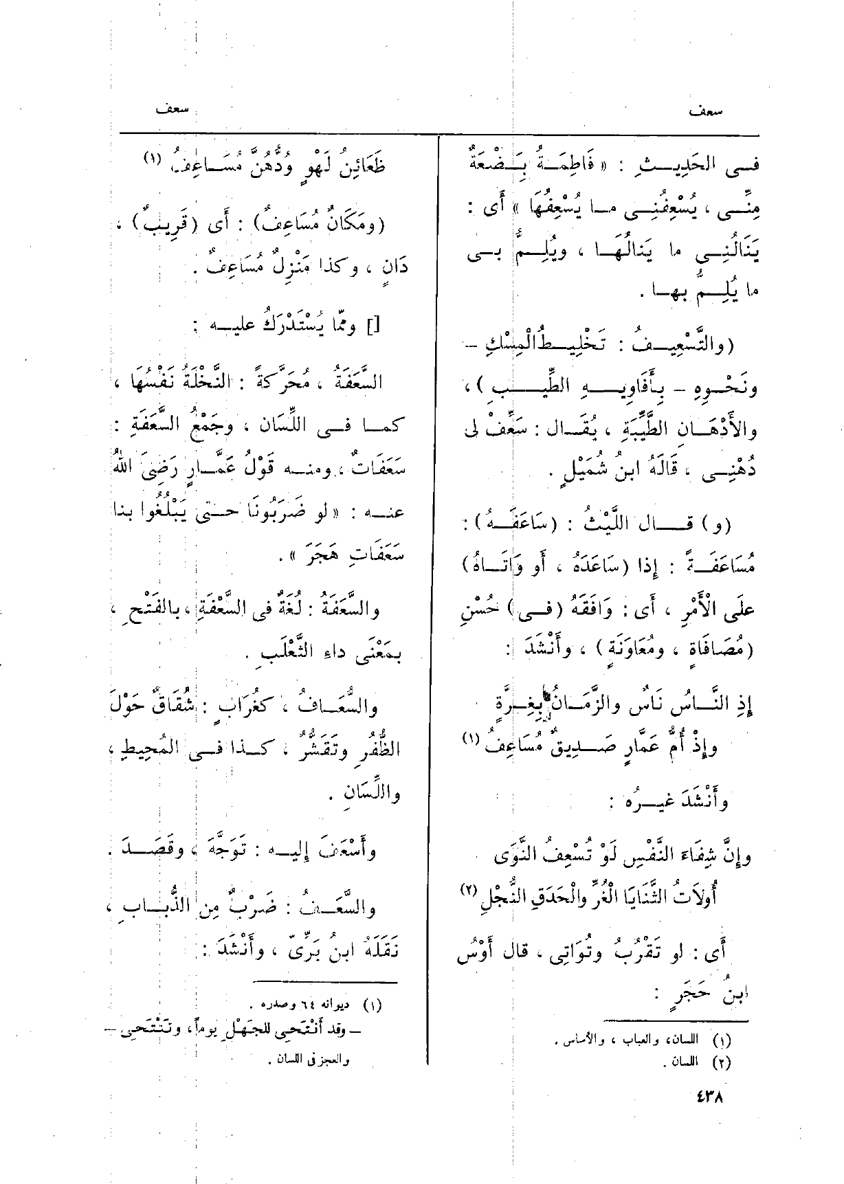ومّما يُسْتَدْرَكُ عَلَيْهِ: السَّعَفَةُ، مُحَرَّكةً: النَّخْلَةُ نَفْسُهَا، كَمَا فِي اللِّسَان، وجَمْعُ السَّعَفَةِ: سَعَفَاتٌ، وَمِنْه قَوْلُ عَمَّارٍ رَضِيَ اللهُ عَنهُ: لَو ضَرَبُونَا حَتَّى يَبْلُغُوا بِنَا سَعَفَاتِ هَجَرَ.