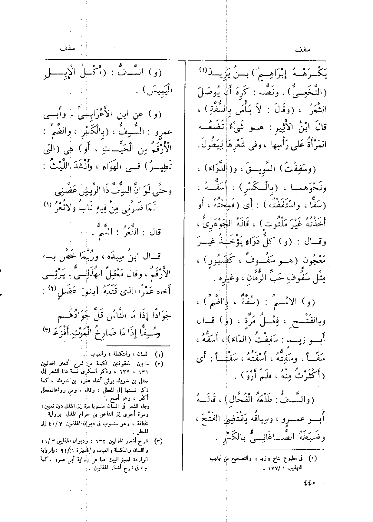 السَّفُّ: أَكُلُّ الإِبِلِ الْيَبِيسَ. عَن ابنِ الأعْرَابِيِّ، وأَبي عمروٍ:} السُّفُّ، بالْكَسْرِ، والضَّمِّ: الأَرْقَمُ مِن الْحَياتِ، أَو هِيَ الَّتِي تَطِيرُ فِي الهَوَاءِ، وأَنْشَدَ اللَّيْثُ: