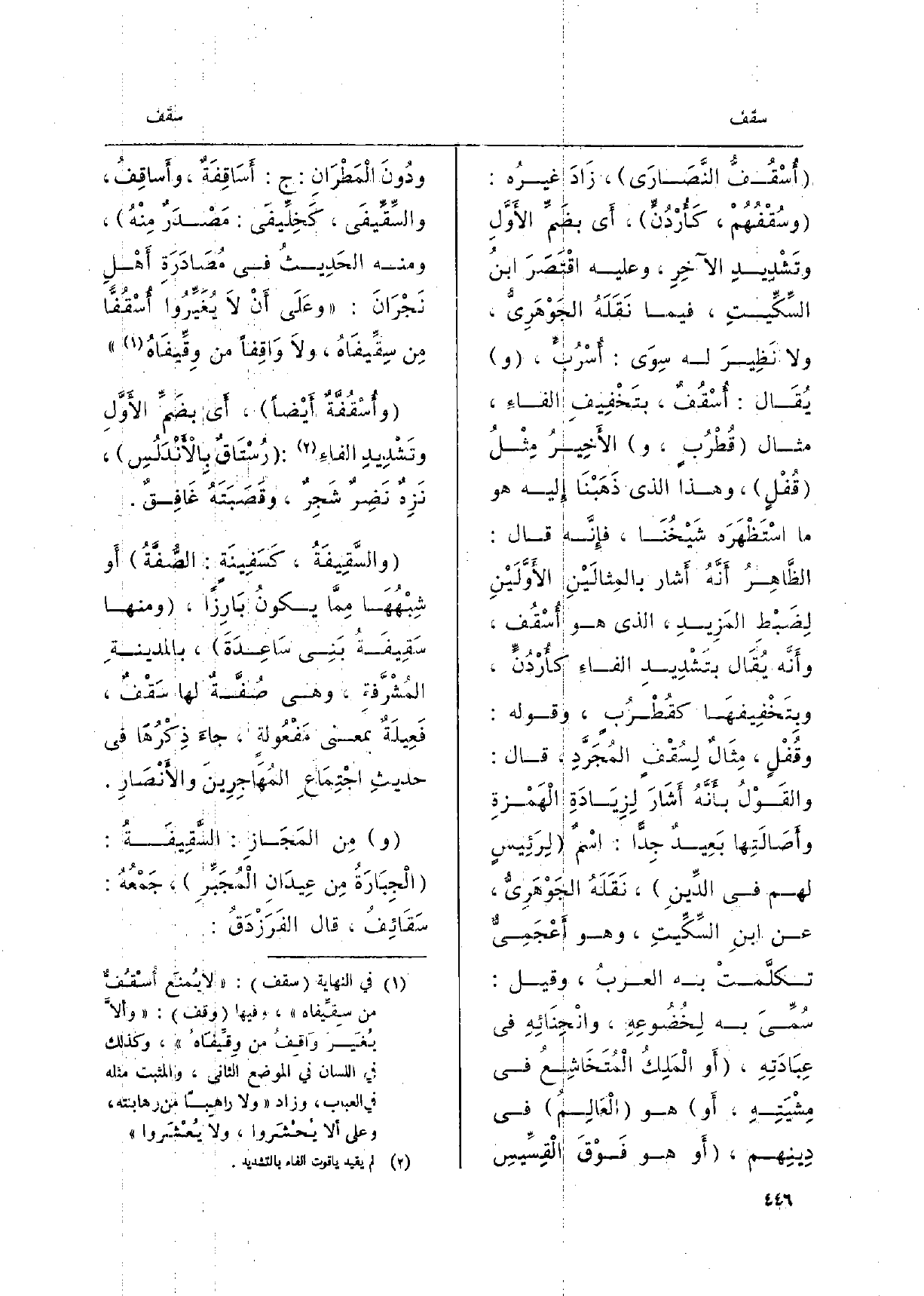 أُسْقُفُّ النَّصَارَى، زَادَ غيرُه: وسُقْفُهُمْ، كَأُرْدُنٍّ، أَي بضَمِّ الأَوَّلِ وتَشْدِيدِ الآخِرِ، وَعَلِيهِ اقْتَصَرَ ابنُ السِّكِّيتِ، فِيمَا نَقَلَهُ الجَوْهَرِيُّ. وَلَا نَظِيرَ لَهُ سِوَى: أُسْرُبٍّ،) يُقَال: أُسْقُفٌ، بتَخْفِيفِ الفاءِ، مِثَال قُطْرُبٍ، والأَخِيرُ مِثْلُ قُفْلٍ، وَهَذَا الَّذِي ذَهَبْنَا إِلَيْهِ هُوَ مَا اسْتَظْهَرَه شَيْخُنَا، فإنَّه قَالَ: الظَّاهِرُ أَنَّهُ أَشار بالمِثالَيْنِ الأَوَّلَيْنِ لِضَبْطِ المَزِيدِ، الَّذِي هُوَ أَسْقُف، وَأَنه يُقَال بتَشْدِيدِ الفاءِ كأُرْدُنٍّ، وبِتَخْفِيفَها كقُطْربٍ، وَقَوله: وقُفْلٍ، مِثَالٌ لِسُقْفٍ المُجَرَّدِ، قَالَ: والقَوْلُ بأَنَّهُ أشَارَ لِزِيَادَةِ الْهَمْزةِ وأصَالَتِها بَعِيدٌ جِداًّ: اسٍ مٌ لِرَئِيسٍ لَهُم فِي الدِّينِ، نَقَلَهُ الجَوْهَرِيُّ، عَن ابنِ السِّكِّيتِ، وَهُوَ أَعْجَمِيٌّ تكُلُّمتٍ بِهِ العربُ، وَقيل: سُمِّيَ بِهِ لُِخُضوعِهِ، وانْحِنَائِهِ فِي عِبَادَتَهَ، أَو الْمَلِكُ الْمُتَخَاشِعُ فِي مشيته أَو هُوَ الْعَالم فِي دِينِهم، أَو هُوَ فَوْقَ الْقِسِّيسِ ودُونَ الْمَطْرَانِ: ج: أَسَاقِفَةُ، وأساقِفُ، والسِّقِّيفَي، كَخِلِّيفَي: مَصْدَرٌ مِنْهُ، وَمِنْه الحَدِيثُ فِي مُصَادَرَةِ أَهْلِ نَجْرَانَ: وعَلَى أنْ لاَ يُغَيِّرُوا أَسْقُفَّا مِن سِقِّيفَاهُ، ولاَ وَاقِفاً من وِقِّيفَاهُ وأسْقُفَّةٌ أَيْضاً، أَي بضَمِّ الأَوَّلِ وتَشْدِيدِ الفاءِ: رُسْتَاقٌ بِالأَنْدَلُسِ، نَزِهٌ نَضِرٌ شَجِرٌ، وقَصَبَتَهُ غَافِقٌ.