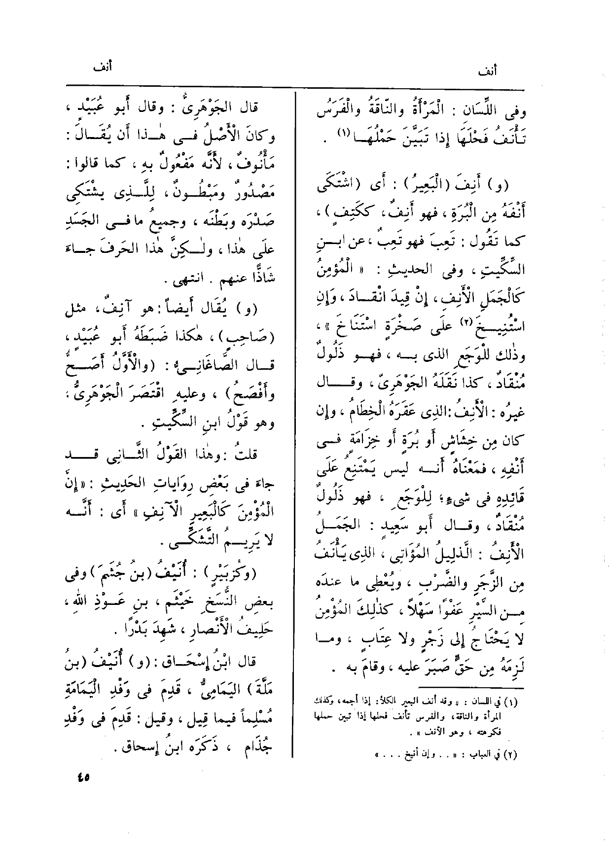 وَفِي اللِّسَان: الْمَرْأَةُ والنّاقَةُ والْفَرَسُ تَأْنَفُ فَحْلَهَا إِذا تَبَيَّنَ حَمْلُهَا. أَنِفَ الْبَعِيرُ: أَي اشْتَكَى {أَنْفَهُ مِن الْبُرَةِ، فَهُوَ أَنِفٌ، ككَتِفٍ، كَمَا تَقُول: تَعِبَ فَهُوَ تَعِبٌ، عَن ابنِ السِّكِّيتِ، وَفِي الحديثِ:) الْمُؤمِنُ كَالجْمَلِ} الأَنِفِ، إِنْ قِيدَ انْقادَ، وَإِنِ اسْتُنِيخَ عَلَى صَخْرَةٍ اسْتَنَاخَ (، وَذَلِكَ للْوَجَعِ الَّذِي بِهِ، فَهُوَ ذَلُولٌ مُنْقَادٌ، كَذَا نَقَلَهُ الجَوْهَرِيُّ، وَقَالَ غيرُه: الأَنِفُ: الذِي عَقَرَهُ الْخِطَامُ، وإِن كَانَ مِن خِشَاشٍ أَو بُرَةٍ أَو خِزَامَةٍ فِي أَنْفِهِ، فمَعْنَاهُ أَنه لَيْسَ يَمْتَنِعُ عَلَى قَائِدِهِ فِي شيءٍ لِلْوَجَعِ، فَهُوَ ذَلُولٌ مُنْقَادٌ، وَقَالَ أَبو سَعِيدٍ: الجَمَلُ الأَنِفُ: الَّذلِيلُ المُؤَاتِي، الذِي {يَأْنَفُ مِن الزَّجَرِ والضَّرْبِ، ويُعْطِي مَا عندَه من السَّيْرِ عَفْواً سَهْلاً، كذلِكَ المُؤْمِنُ لَا يَحْتَاجُ إِلَى زَجْرٍ وَلَا عِتَابٍ، وَمَا لَزِمَهُ مِن حَقٍّ صَبَرَ عَلَيْهِ، وقامَ بِهِ. قَالَ الجَوْهَرِيُّ: وَقَالَ أَبو عُبَيْدٍ، وكانَ الأَصْلُ فِي هَذَا أَن يُقَال:} مَأْنُوفٌ، لأَنَّه مَفْعُولٌ بهِ، كَمَا قَالُوا: مَصْدُورٌ ومَبْطُون، لِلَّذِي يشْتَكِي صَدْرَه وبَطْنَه، وجميعُ مَا فِي الجَسَدِ عَلَى هَذَا، ولكِنَّ هَذَا الحَرفَ جاءَ شَاذاًّ عَنْهُم. انْتهى. يُقَال أَيضاً: هُوَ {آنِفٌ، مثل صَاحِبٍ، هَكَذَا ضَبَطَهُ أَبو عُبَيْدٍ، قَالَ الصَّاغَانيُّ: والأَوَّلُ أَصَحُّ وأَفْصَحُ، وعليهِ اقْتَصَرَ الجَوْهَرِيُّ، وَهُوَ قَوْلُ ابنِ السِّكِّيتِ.