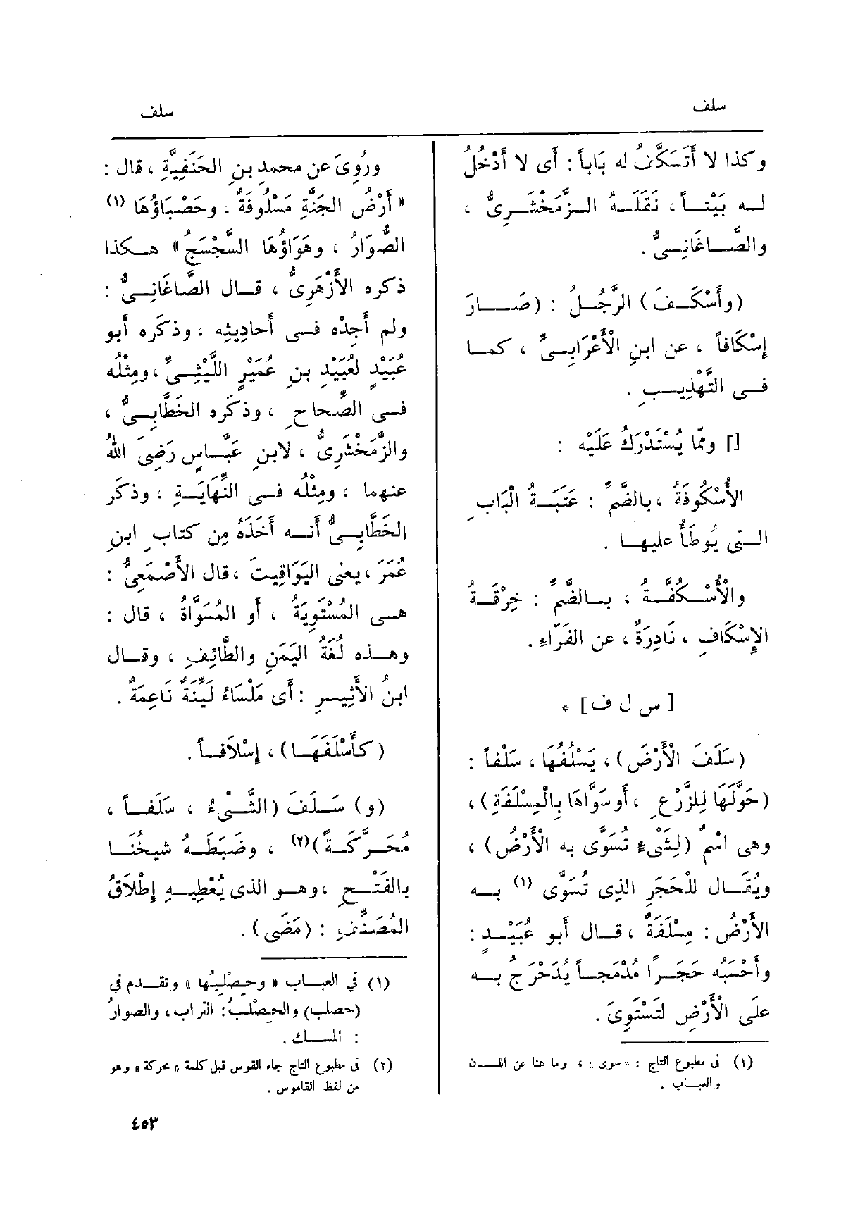 ورُوىَ عَن مُحَمَّد بنِ الحَنَفِيَّةِ، قَالَ:) أرْضَ الجَنَّةِ مَسْلُوفَةٌ، وحَصْبَاؤُهَا الصُّوَارُ، وهَوَاؤُهَا السَّجْسَجُ هَكَذَا ذكره الأَزْهَرِيُّ، قَالَ الصَّاغَانِيُّ: وَلم أَجِدْه فِي أحاديثِه، وذكَره أَبُو عُبَيْدٍ لُعَبْيدِ بنِ عُمَيْرٍ اللَّيْثِيِّ، ومِثْلُه فِي الصِّحاحِ، وذكَره الخَطَّابِيُّ، والزَّمَخْشَرِيُّ، لابنِ عَبَّاسٍ رَضِيَ اللهُ عَنْهُمَا، ومِثْلُه فِي النِّهَايَةِ، وذكَر الخَطَّابِيُّ أَنه أَخَذَهُ من كتابِ ابنِ عُمَرَ، يَعْنِي اليَوَاقِيتَ، قَالَ الأصْمَعِيُّ: هِيَ المُسْتَوِيَةُ، أَو المُسَوَّاةُ، وَقَالَ: وَهَذِه لُغَةُ اليَمَنِ والطَّائِفِ، وَقَالَ ابنُ الأَثِيرِ: أَي مَلْسَاءٌ لَيِّنَةٌ نَاعِمَةٌ.
