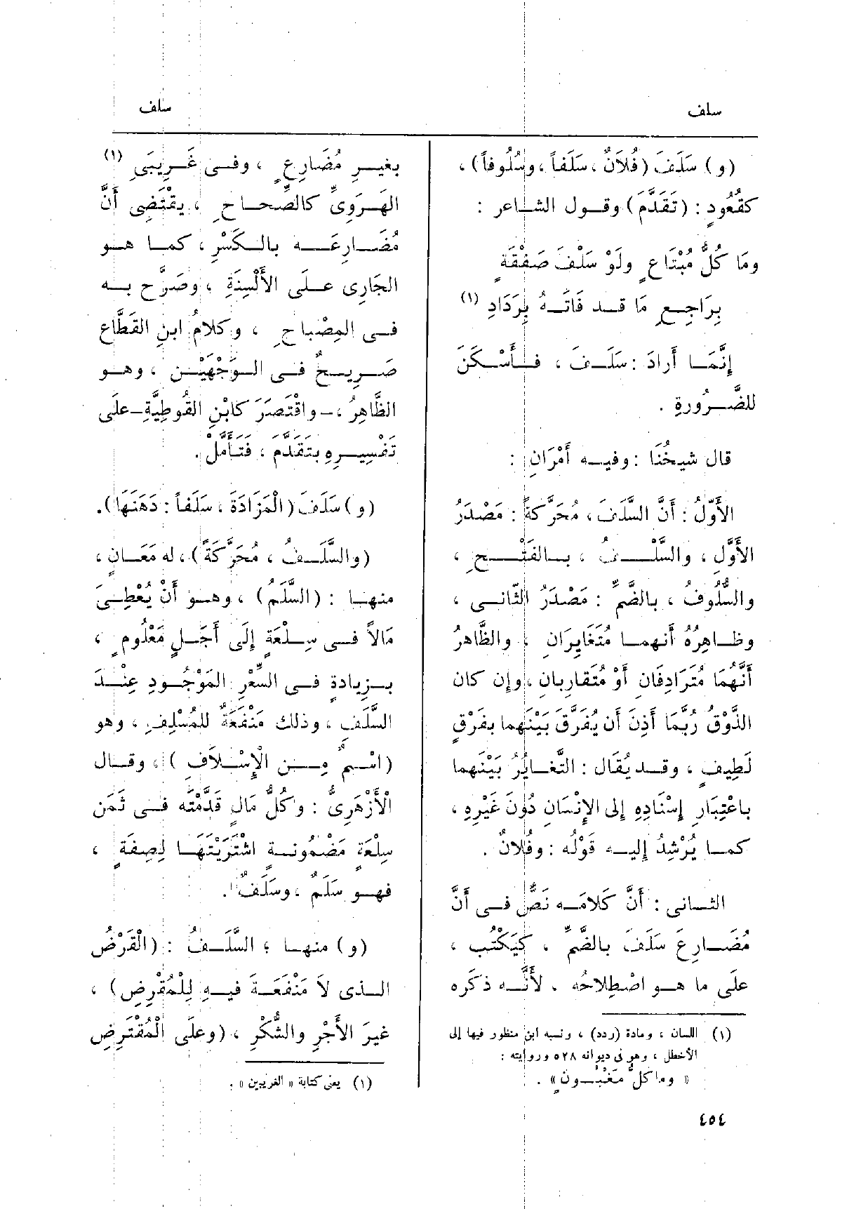 الثَّانِي: أَنَّ كُلُّاَمه نَصَّ فِي أَنَّ مُضَارِعَ سَلَفَ بالضَّمِّ، كيَكْتُب، علَى مَا هُوَ اصْطِلاحُه، لأَنَّه ذكَره بغيرِ مُضَارِعٍ، وَفِي غَرِيبَيِ الهَرَوِيِّ كالصِّحاحِ، يقْتضِي أَنَّ مُضَارِعَه بالكَسْرِ، كَما هُوَ الجَارِي علَى الأَلْسِنَةِ، وصَرَّح بِهِ فِي المِصْباحِ، وكُلُّامُ ابنِ القَطَّاع صَرِيحٌ فِي الوَجْهَيْن، وَهُوَ الظَّاهِرُ، واقْتَصَرَ كابْنِ القُوطِيَّةِ علَى تَفْسِيرِهِ بتَقَدَّمَ، فَتَأَمَّلْ. سَلَفَ الْمَزَادَةَ، سَلَفاً: دَهَنَهَا. والسَّلَفُ، مُحَرَّكَةً، لَهُ مَعَانٍ مِنْهَا: السَّلَمُ، وَهُوَ أَنْ يُعْطِىَ مَالاً فِي) سِلْعَةِ إِلَى أَجَلٍ مَعْلُومٍ، بِزيارةٍ فِي السِّعْرِ المَوْجُودِ عِنْدَ السَّلَفِ، وَذَلِكَ مَنْفَعَةٌ للمُسْلِفِ، وَهُوَ اسمٌ مِن الإسْلاَفِ، وَقَالَ الأَزْهَرِيُّ: وكُلُّ مَالٍ قَدَّمْتَه فِي ثَمَن سِلْعَةٍ مَضْمُونةٍ اشْتَرَيْتَهَا لِصِفَةٍ، فَهُوَ سَلَمٌ، وسَلَفٌ.