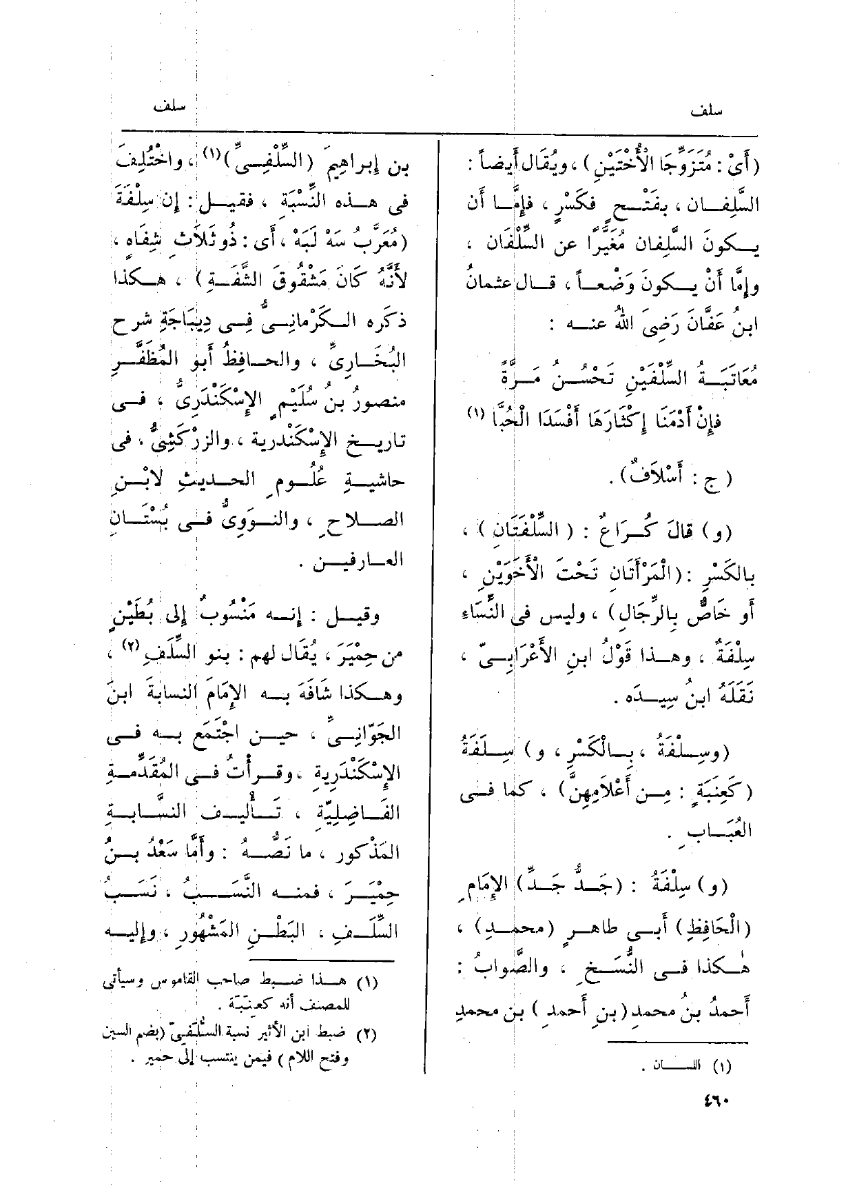 ج: أَسْلاَفٌ قَالَ كُرَاعٌ: السِّلْفَتَانِ، بالكَسْرِ: الْمَرْأَتَانِ تَحْتَ الأَخَوَيْنِ، أَو خَاصٌّ بِالرِّجَالِ، وَلَيْسَ فِي النِّسَاءِ سِلْفَةٌ، وَهَذَا قَوْلُ ابنِ الأَعْرَابِيُّ، نَقَلَهُ ابنُ سِيدَه. وسِلْفَةُ، بالْكَسْرِ، وسِلَفَةُ كَعِنَبَةٍ: مِن أَعْلاَمِهِنَّ، كَمَا فِي العُبَاب. سِلْفَةُ: جَدُّ جَدُّ الإِمَامِ الْحَافِظِ أَبي طاهرٍ محمدِ، هَكَذَا فِي النُّسَخِ، والصَّوابُ: أَحمدُ بنُ محمدِ بنِ أَحمدِ بن محمدِ بن إبراهِيمَ السِّلْفِيِّ، واخْتُلِفَ فِي هَذِه النِّسْبَةِ، فَقيل: إِن سِلْفَةَ مُعَرَّبُ سَهْ لَبَهْ، أَي: ذُو ثَلاَثِ شِفَاهٍ، لأَنَّهُ كَانَ مَشْقُوقَ الشَّفَةِ، هَكَذَا ذكَره الكَرْمانِيُّ فِي دِيبَاجَةِ شرح البُخَارِيِّ، والحافِظُ أَبُو المُظَفَّرِ منصورُ بنُ سُلَيْمٍ الإسْكَنْدَرِيُّ، فِي تَارِيخ الإسْكَنْدرية، والزرْكَشِيُّ، فِي حاشيةِ عُلُومِ الحديثِ لابْنِ الصلاحِ، والنوَوِيُّ فِي بُسْتَانِ العارفين.