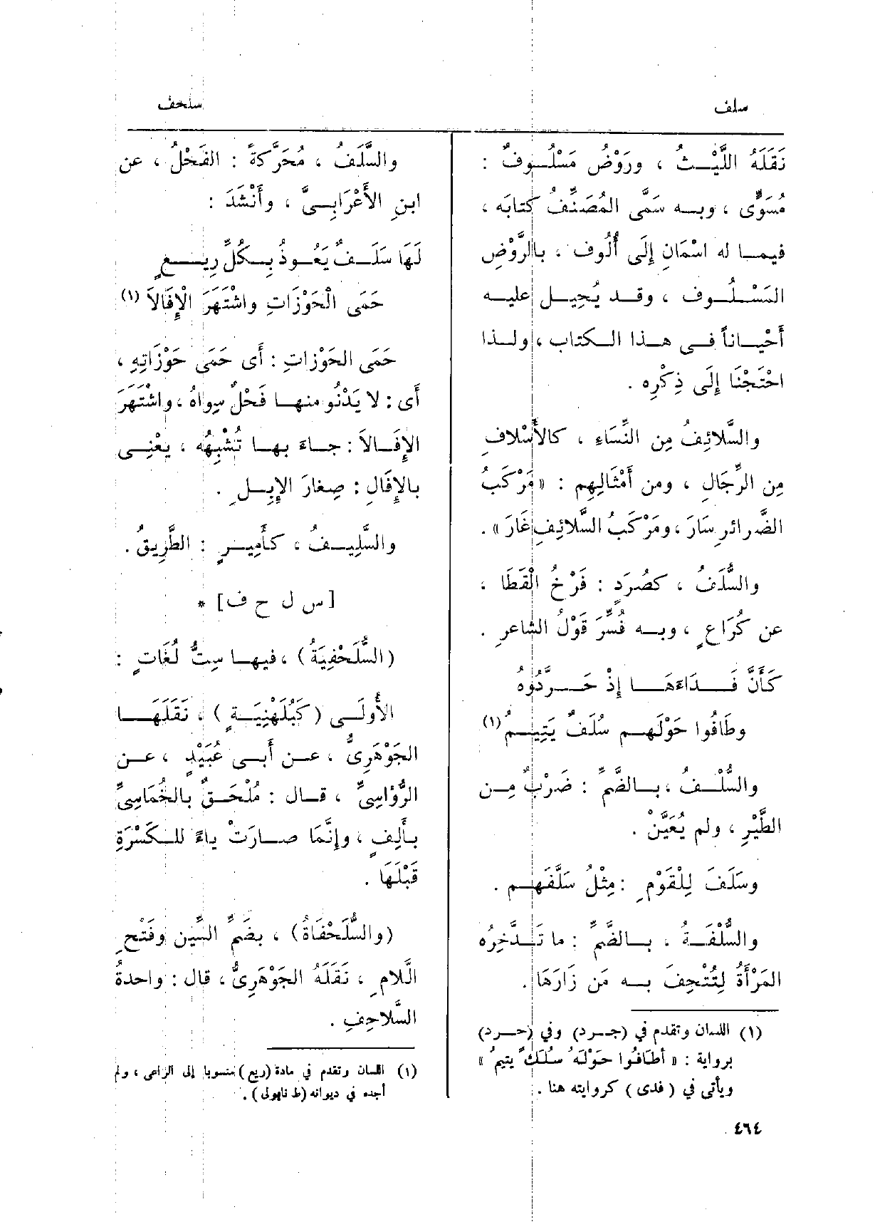 نَقَلَهُ اللَّيْثُ، ورَوْضُ مَسْلُوفٌ: مُسَوىٍّ، وَبِه سَمَّي المُصَنِّفُ كتابَه، فِيمَا لَهُ اسْمَانِ إِلَى أُلُوف، بالرَّوْضِ المَسْلُوف، وَقد يُحِيل عَلَيْهِ أَحْياناً فِي هَذَا الْكتاب، وَلذَا احْتجْنَا إلَى ذِكْرِه.