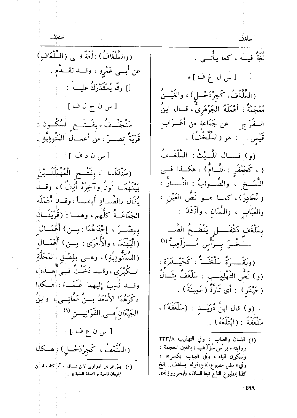 وَقَالَ اللَّيْثُ: السَّلْغَفٌ، كَجَعْفَرٍ: التَّامُّ، هَكَذَا فِي النُّسَخِ، والصَّوابُ: التَّارُّ، الْحَادِرُ، كَمَا هُوَ نَصُّ العَيْنِ، والعُبَابِ، واللِّسَانِ، وأَنْشَدَ: