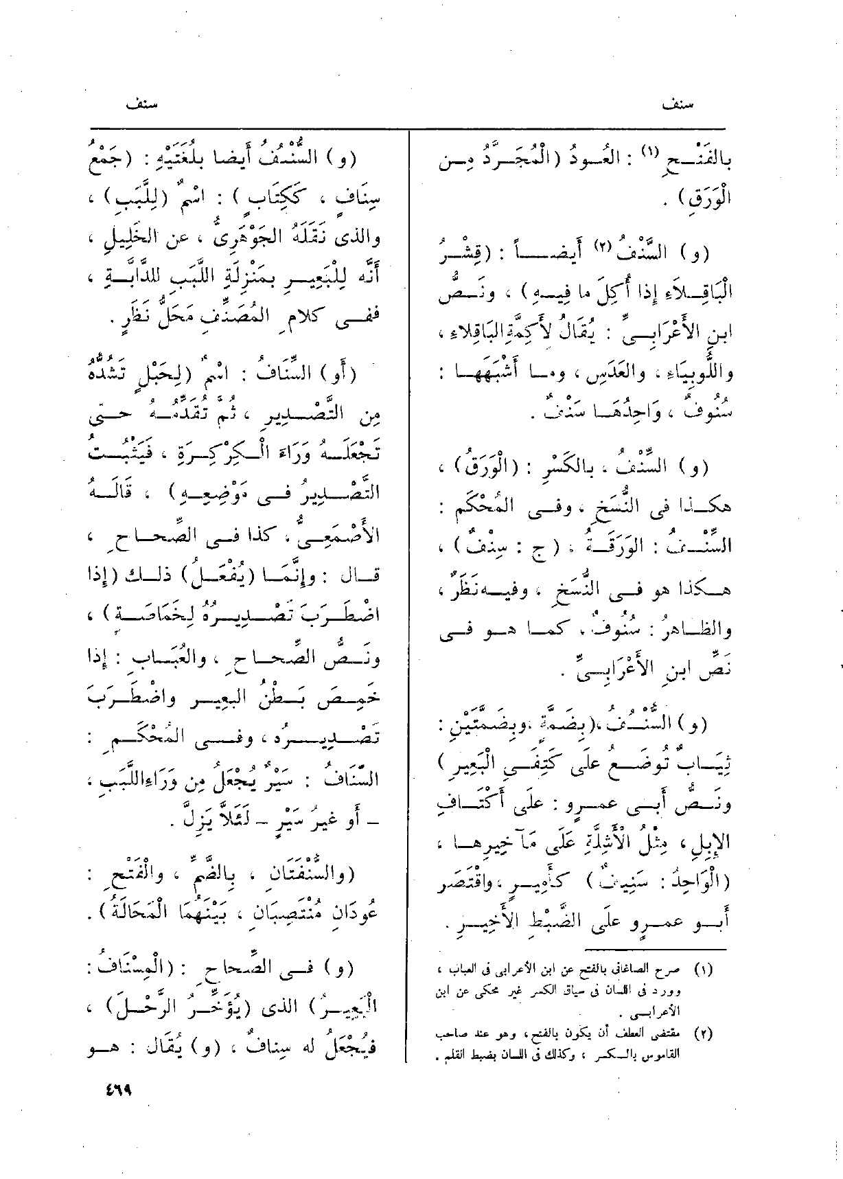 السُّنُفُ: بِضَمَّةٍ، وبِضَمَّتَيْنِ: ثِيَابٌ تُوضَعُ علَى كَتِفَيِ الْبَعِيرِ ونَصُّ أَبي عمروٍ: علَى أَكْتَافِ الإِبِلِ، مِثْلُ الأَشِلَّةِ عَلَى مَآخِيرِها، الْوَاحِدُ: سَنِيفٌ كأَمِيرٍ، واقْتَصَر أَبُو عمروٍ على الضَّبْطِ الأخِيرِ.