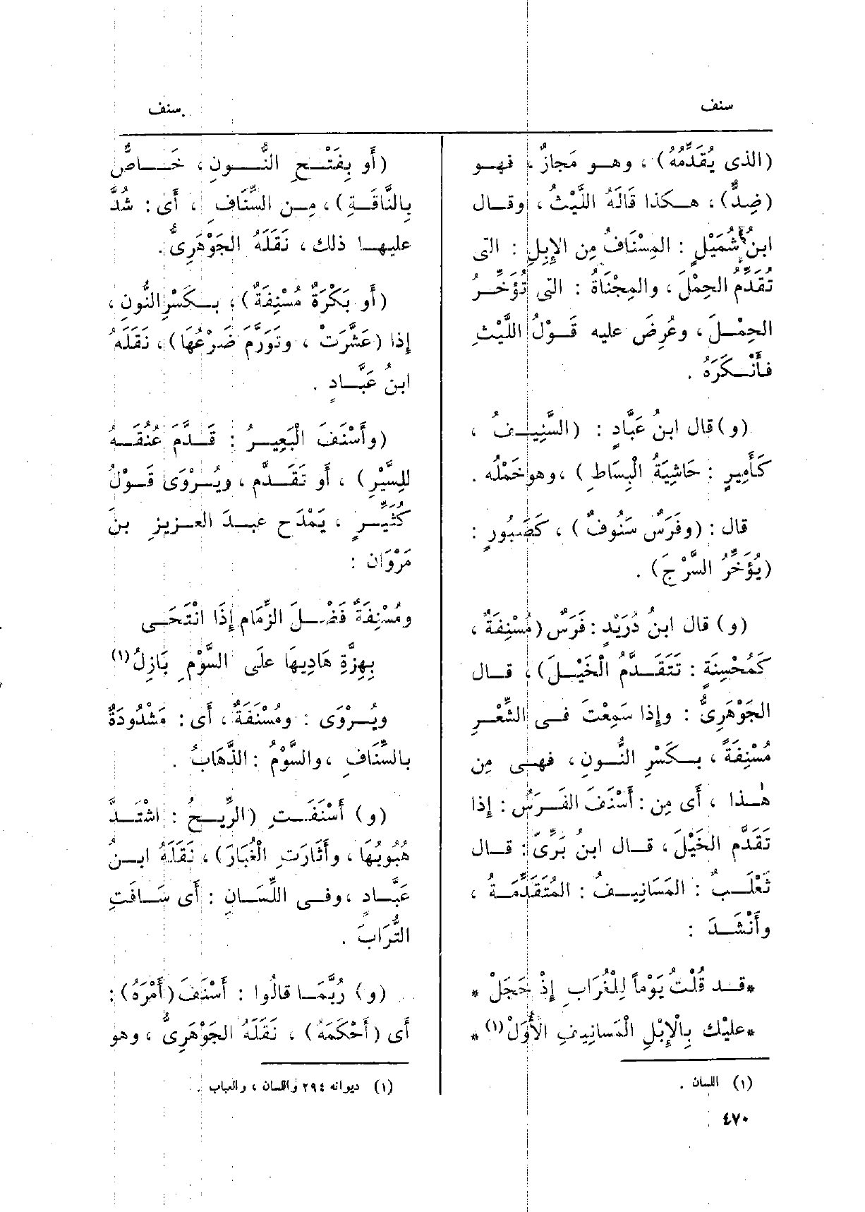 وأَسْنَفَ الْبَعِيرُ: قَدَّمَ عُنُقَهُ للِسَّيْرِ، أَو تَقَدَّم، ويُرْوَي قَوْلُ كَثَيِّرٍ، يَمْدَح عبدَ العزيزِ بنَ مَرْوَان: