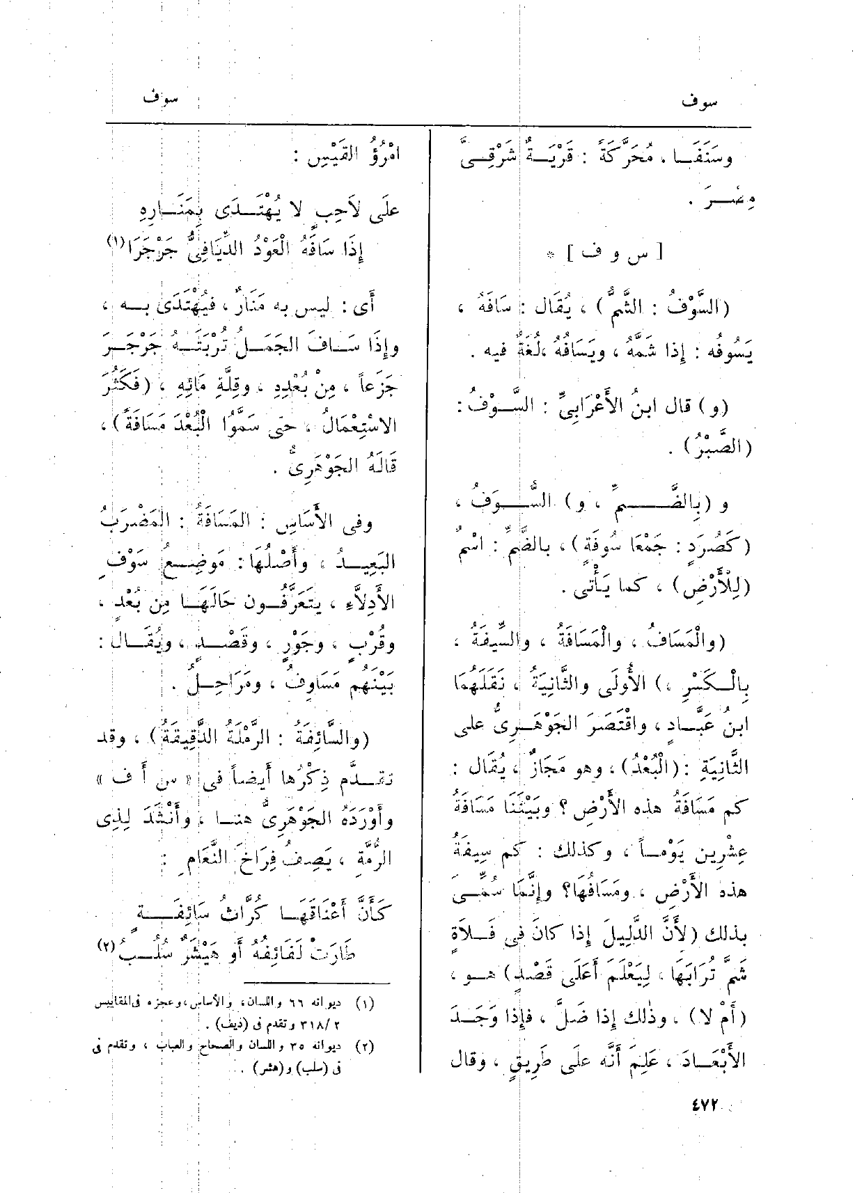 وبِالضَّمِّ، و) } السُّوَفُ كَصُرَدٍ: جَمْعَا {سُوفَةٍ، بِالضَّمِّ: اسْمٌ لِلأَرْضِ، كَمَا يَأْتي.