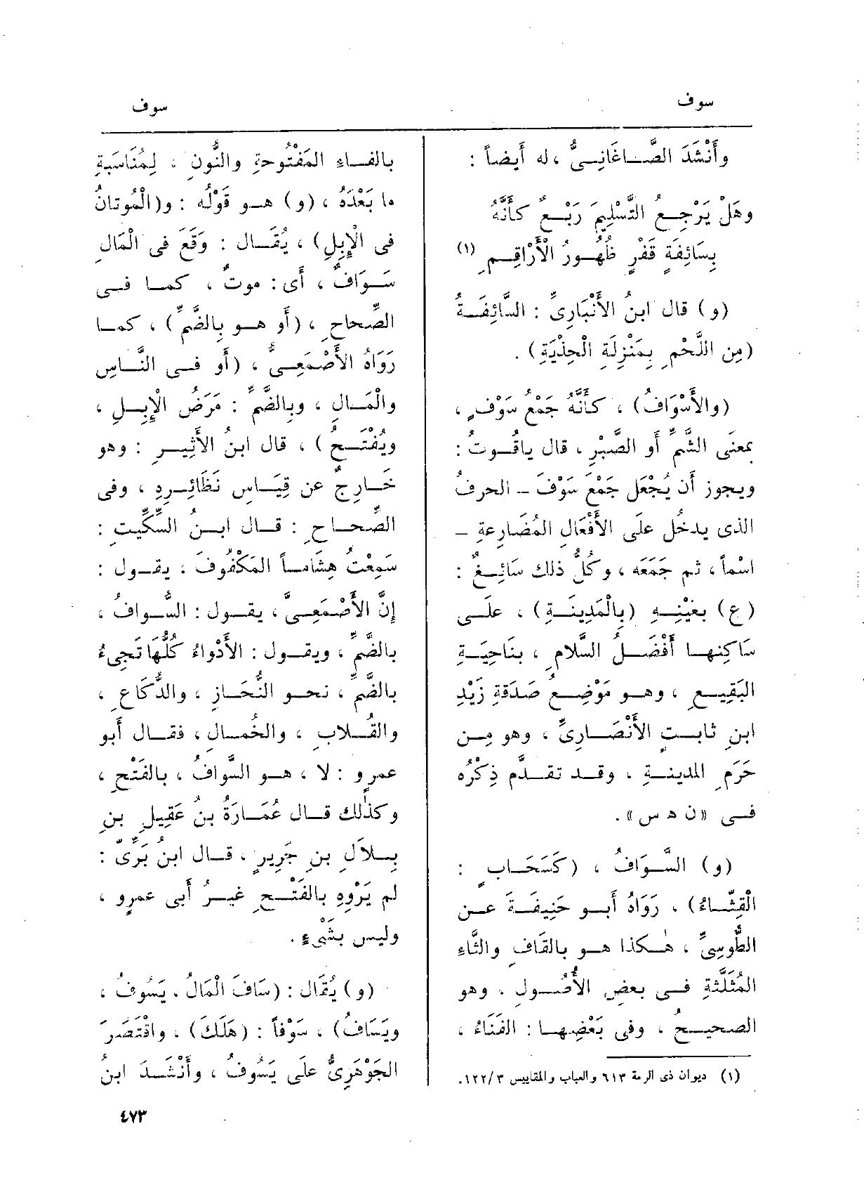 بعضِ الأُصُولِ، وَهُوَ الصحيحُ، وَفِي بَعْضِها: الفَنَاءُ، بالفاءِ المَفْتُوحةِ والنُّونِ، لِمُنَاسَبةِ مَا بَعْدَهُ، هُوَ قَوْلُه: والمْوُتانُ فِي الإِبِلِ، يًقَال: وَقَعَ فِي الْمَالِ {سَوَافٌ، أَي: موتٌ كَمَا فِي الصِّحاحِ، أَو هُوَ بِالضَّمِّ، كَمَا رَوَاهُ الأَصْمَعِيَّ، أَو فِي النَّاسِ والْمَالِ، وبِالضَّمِّ: مَرَضُ الإِبِلِ، ويُفْتَحُ، قَالَ ابنُ الأَثِيرِ: وَهُوَ خَارِجٌ عَن قِيَاسِ نَظَائِرِهِ، وَفِي الصِّحاحِ: قَالَ ابنُ السِّكِّيتِ: سَمِعْتُ هِشَاماً المَكْفُوفَ، يَقُول: إِنَّ الأَصْمَعِيَّ، يَقُول:} السُّوافُ، بالضَّمِّ، وَيَقُول: الأَدْواءُ كُلُّهَا تَجيءُ بِالضَّمِّ، نَحْو النُّحَازِ، والدُّكَاعِ، والقُلابِ، والخُمالِ، فَقَالَ أَبو عمروٍ: لَا، هُوَ السَّوافُ، بالفَتْحِ، وَكَذَلِكَ قَالَ عُمَارَةُ بنُ عَقِيلِ بن بِلاَلِ بنِ جَرِيرٍ، قَالَ ابنُ بَرِّيّ: لم يَرْوِهِ بالفَتْحِ غيرُ أبي عمروٍ، وَلَيْسَ بشَيْءٍ. يُقَال: {سَافَ الْمَالُ،} يَسُوفُ، {ويَسَافُ،} سَوْفاً: هَلَكَ، واقْتَصَرَ الجَوْهَرِيُّ علَى يَسُوفُ، وأَنْشَدَ ابنُ