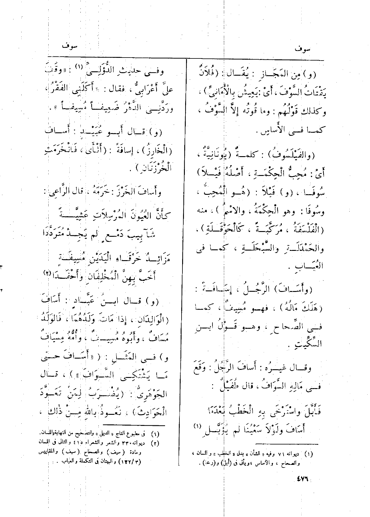 وَقَالَ غيرُه: {أَسافَ الرَّجُلُ: وَقَعَ فِي مَالِهِ} السَّوَافُ، قَالَ طُفَيْلٌ:)