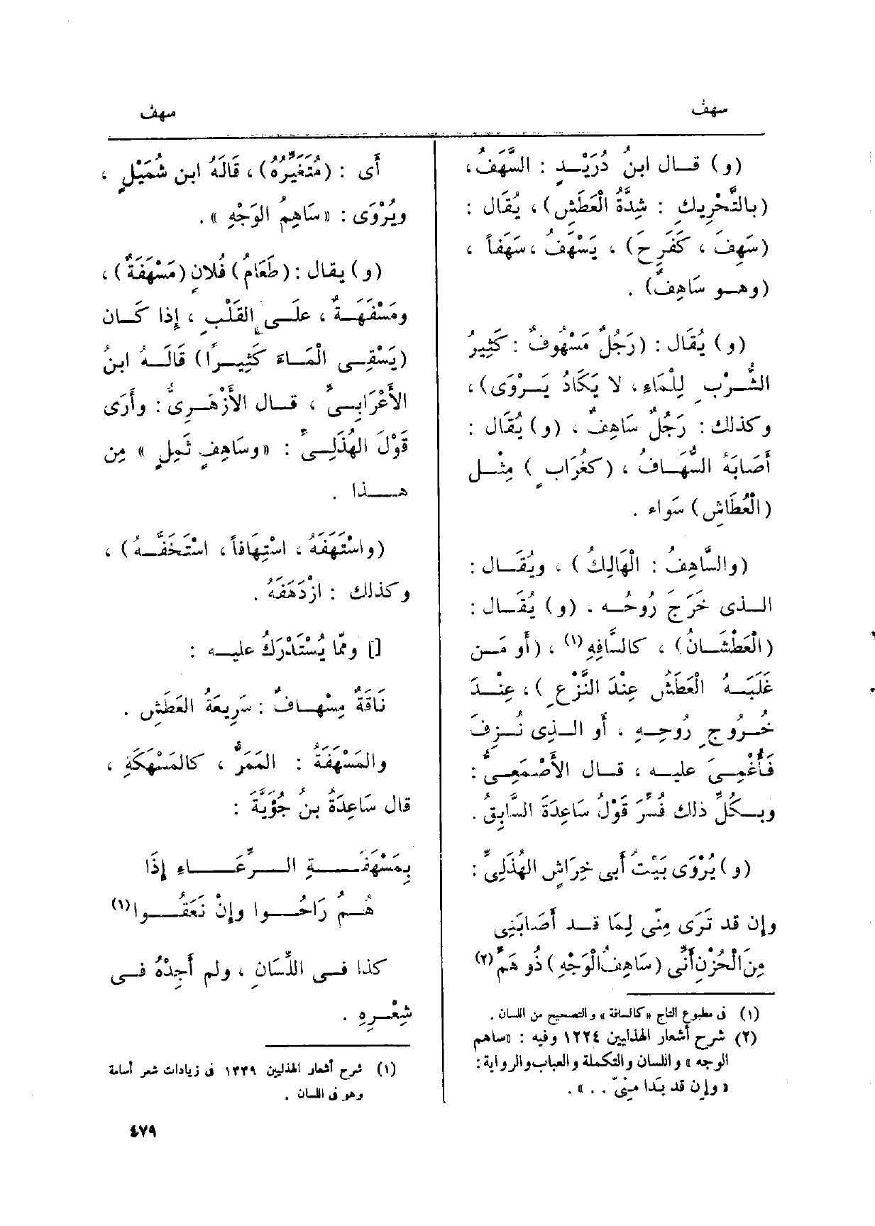 والسَّاهِفُ: الْهَالِكَ، ويُقَال: الَّذِي خَرَجَ رُوحُه، ويُقَال الْعَطْشَانُ، كالسَّافِهِ، أَو مَن غَلَبَهُ الْعَطَشُ عنْدَ النَّزْعِ، عِنْدَ خُرُوجِ رُوحِهِ، أَو الذِي نُزِفَ فأُغْمِيَ عَلَيْهِ، قَالَ الأَصْمَعِيُّ: وبكُلِّ ذَلِك فُسِّرِ قَوْلُ سَاعِدَةَ السَّابِقُ. يُرْوَي بَيْتُ أَبي خِرَاشٍ الهُذَلِيِّ: وَإِن قد تَرَى مِنّي لِمَا قد أَصَابَنِي مِنَ الْحُزْنِ أَنِّي سَاهِفُ الْوَجْهِ ذُو هَمِّ أَي: مُتَغَيِّرُهُ، قَالَهُ ابْن شُمَيْلٍ، ويُرْوَي، سَاهِمُ الوَجْهِ.