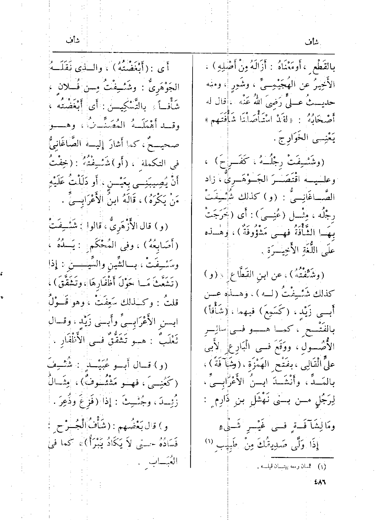 {وشَئِفْتُهُ، عَن ابنِ القَطَّاعِ، كَذَلِك شَئِفْتُ لَهُ، وَهَذِه عَن أَبي زَيْدٍ، كَسَمَعِ فيهمَا،} شَأْفاً بالفَتْحِ، كَمَا هُوَ فِي سائِرِ الأُصُولِ، ووَقَعَ فِي الْبَارِعِ لأَبي عليٍّ الْقَالِي، بفَتْحِ الهَمْزَةِ، {وشَآفَةً، بالمَدِّ، وأَنْشَدَ ابنُ الأَعْرَابِيِّ، لِرَجُلٍ من بني نَهْشَلِ بنِ دَارِمٍ:
