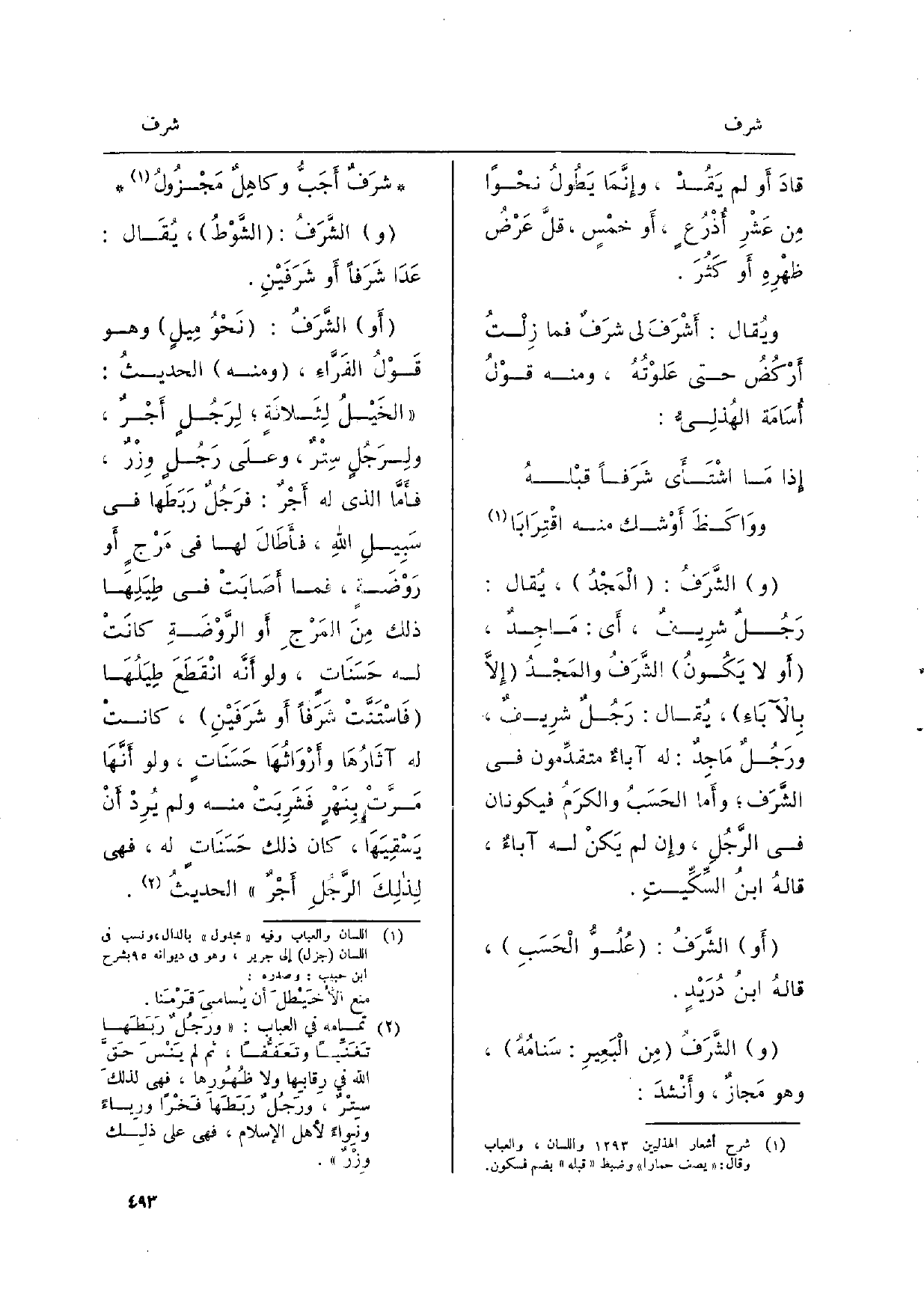 أَو الشَّرَفُ: نَحْوُ مِيلٍ وَهُوَ قَوْلُ الفَرَّاءِ، وَمِنْه الحديثُ:) الخَيْلُ لِثَلاثَةٍ لِرَجُلٍ أَجْرٌ، ولِرَجُلٍ سِتْرٌ، وعلَى رَجُلٍ وِزْرٌ، فأَمَّا الَّذِي لَهُ أَجْرٌ: فرَجُلٌ رَبَطَها فِي سَبِيلِ اللهِ، فأَطَالِ لَهَا فِي مَرْجٍ أَو رَوْضَةٍ، فَمَا أَصَابَتْ فِي طِليَلِهَا ذَلِك مِنَ المَرْجِ أَو الرُّوْضَةِ كانَتْ لَهُ حَسَنَاتٍ، وَلَو أنَّه انْقَطَعَ طِيَلُهَا فَاسْتَنَّتْ شَرَفاً أَو شَرَفَيْنِ، كانتْ لَهُ آثَارُهَا وأَرْوُاثُهَا حَسَنَاتٍ، وَلَو أَنَّهَا مَرَّتْ بِنَهْرٍ فَشَربَتْ مِنْهُ وَلم يُرِدْ أَنْ يَسْقِيَهَا، كَانَ ذَلِك حَسَناَتٍ لَهُ، فَهِيَ لِذلِكَ الرَّجُلِ أَجْرٌ الحديثُ.