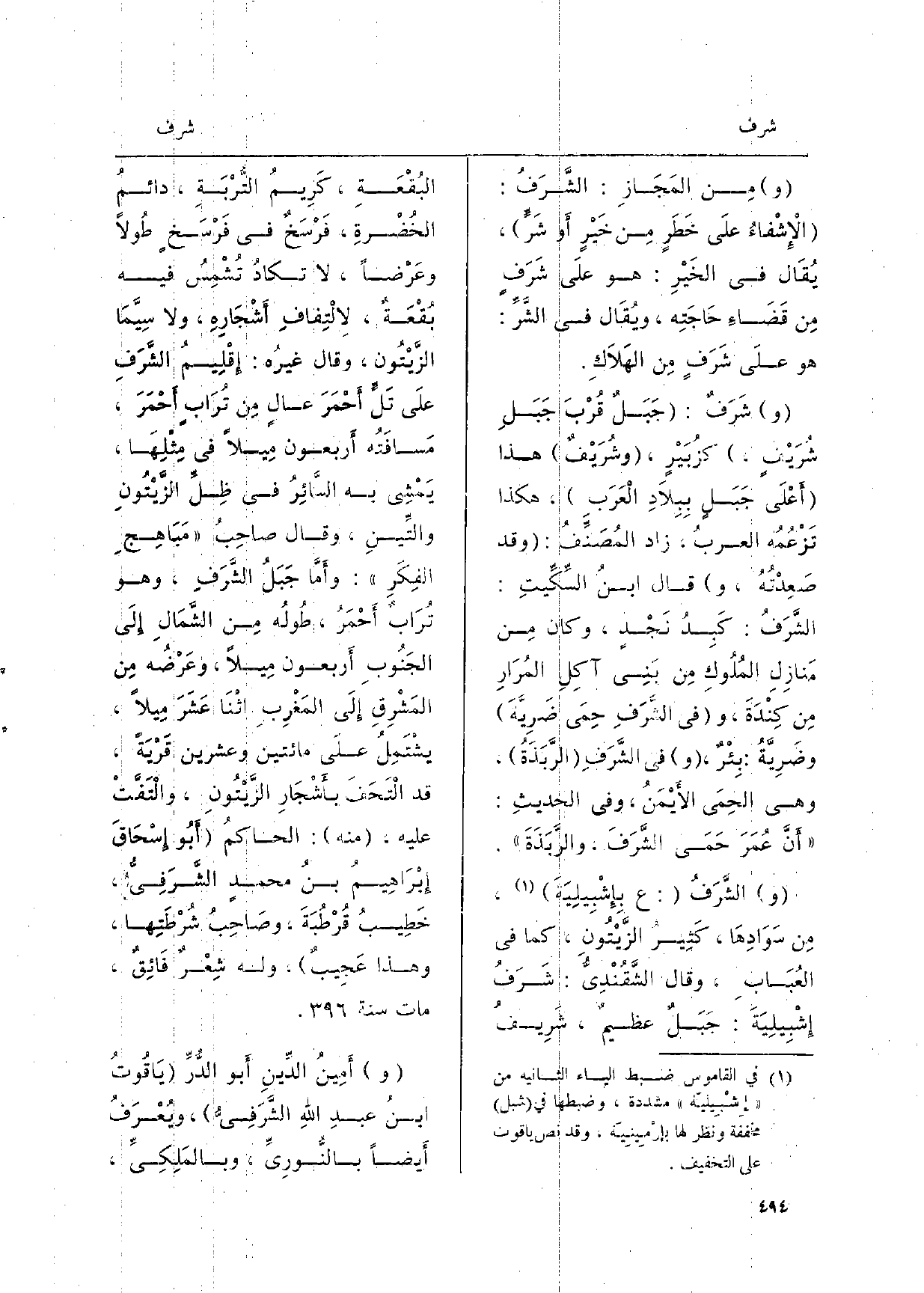 والشَّرَفُ: ع بإِشْبِيلِيَةَ، مِن سَوَادِهَا، كَثِيرُ الزَّيْتُونِ، كَمَا فِي العُبَابِ، وَقَالَ الشَّقُنْدِيُّ: شَرَفُ إِشْبِيلِيَةَ: جَبَل عظيمٌ، شَرِيفُ البُقعة، كَرِيمُ التُّرْبَةِ، دائمُ الخُضْرةِ، فَرْسَخٌ فِي فَرْسَخٍ طُولاً وعَرْضاً، لَا تكادُ تُشْمِسُ فِيهِ بُقْعَةٌ، لاِلْتِفافِ أَشْجَارِهِ، وَلَا سِيَّمَا الزَّيْتُون، وَقَالَ غيرُه: إِقْلِيمُ الشَّرَفِ على تَلٍّ أَحْمَرَ عالٍ مِن تُرَابٍ أَحْمَر مَسافَتُه أَربعون مِيلاً فِي مِثْلِهَا، يَمْشِي بِهِ السَّائِرُ فِي ظِلِّ الزَّيْتُونَ والتِّينِ، وَقَالَ صاحِبُ) مَبَاهِجِ الْفِكر: وأَمَّا جَبَلُ الشَّرفِ، وَهُوَ تُرَابٌ أَحْمَرُ، طُولُه مِن الشَّمَالِ إِلَى الجَنُوبِ أَربعون مِيلاً، وعَرْضُه من المَشْرِقِ إِلَى المَغْرِبِ اثْنَا عَشَرَ مِيلاً، يشْتَمِلُ علَى مِائَتَيْنِ وَعشْرين قَرْيَةً، قد الْتَحَفَ بأَشْجَارِ الزَّيْتُونِ والْتَفَّتْ عَلَيْهِ، مِنْهُ: الحاكمُ أَبُو إسْحَاقَ إبْرَاهِيمُ بنُ محمدٍ الشَّرَفِيُّ، خَطِيبُ قُرْطُبَةَ، وصَاحِبُ شُرْطَتِها، وَهَذَا عَجِيبٌ، وَله شِعْرٌ فَائِقٌ مَاتَ سنة. أَمِينُ الدِّينِ أَبو الدُّرِّ يَاقُوتُ ابنُ عبدِ اللهِ الشَّرَفِيُّ ويُعْرَفُ أَيضاً بالنُّورِيِّ وبالَمَلِكِيِّ،
