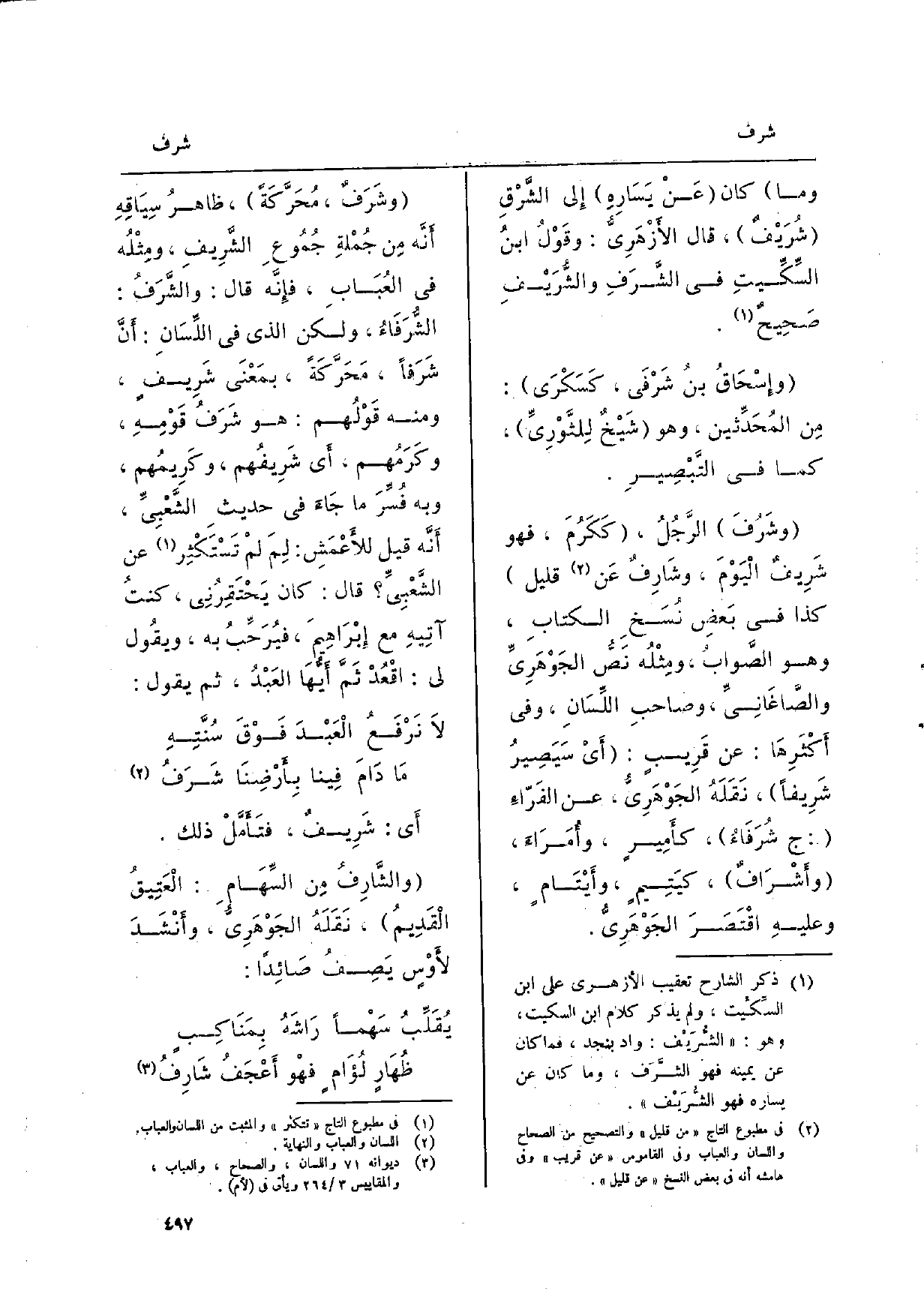 وشَرُفَ الرَّجُلُ، كَكَرُمَ، فَهُوَ شَرِيفٌ الْيَوْمَ، وشَارِفٌ عَن قَلِيل كَذَا فِي بَعضِ نُسَخِ الكتابِ، وَهُوَ الصَّوابُ، ومِثْلُه نَصُّ الجَوْهَرِيُّ والصَّاغَانِيِّ، وصاحبِ اللِّسَانِ، وَفِي أكْثَرِهَا: عَن قَرِيبٍ: أَيْ سَيَصِيرُ شَريفاً، نَقَلَهُ الجَوْهَرِيُّ، عَن الفَراءِ: ج شُرَفَاءُ، كأَمِير، وأُمَرَاءَ، وأَشْرَافٌ، كيَتِيمٍ، وأَيْتَامٍ، عليهِ اقْتَصَرَ الجَوْهَرِيُّ. وشَرَفٌ مُحَرَّكَةً، ظاهرُ سِيَاقِهِ أَنَّه مِن جُمْلةِ جُمُوعِ الشَّرِيفِ، ومِثْلُه فِي العُبَابِ، فإنَّه قَالَ: والشَّرَفُ: الشُّرَفَاءُ، وَلَكِن الَّذِي فِي اللِّسَان: أَنَّ شَرَفاً، مَحَرَّكَةً، بمَعْنَى شَرِيفٍ، وَمِنْه قَوْلُهم: هُوَ شَرَفُ قَوْمِهِ، وكَرَمُهم، أَي شَرِيفُهم، وكَرِيمُهم، وَبِه فُسِّرَ مَا جَاءَ فِي حديثِ الشَّعْبِيِّ، أنَّه قيل للأعْمَشِ: لِمَ لمْ تَسْتَكْثِر عَن الشَّعْبِيِّ قَالَ: كَانَ يَحْتَقِرُنِي، كنتُ آتِيهِ مَعَ إبْرَاهِيمَ، فيُرَحِّبُ بِهِ، ويقُول لي: اقْعُدْ ثَمَّ أَيُّهَا العَبْدُ، ثمَّ يَقُول: