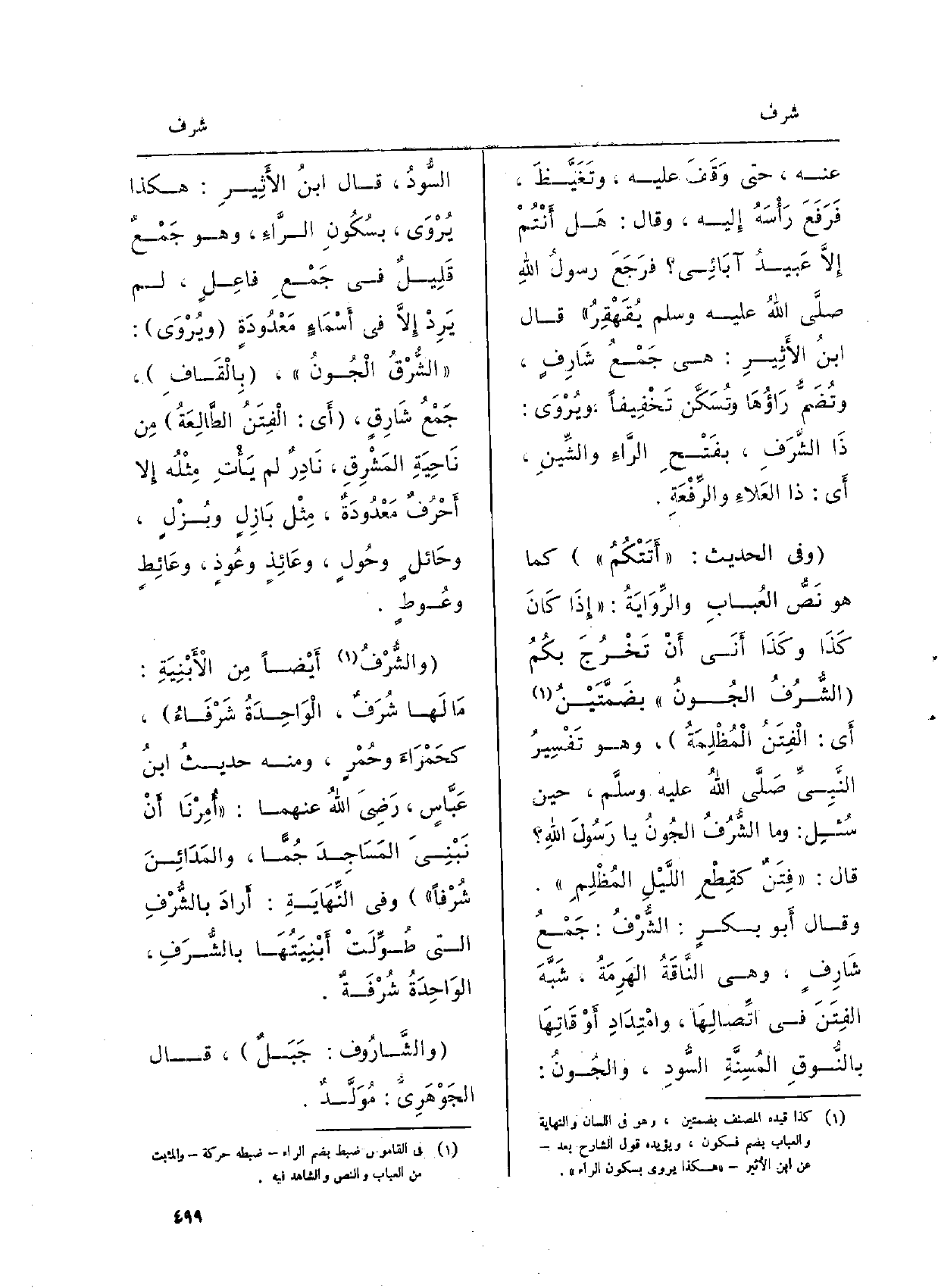 وَفِي الحَدِيث:) أتَتْكُمُ (كَمَا هُوَ نَصُّ العُبابِ والرِّوَايَةُ:) إِذا كَانَ كَذَا وكَذَا أَنَي أَنْ تَخْرُجَ بكُمُ الشُّرُفُ الجُونُ بضَمَّتْيْنُ أَي: الْفِتَنْ المُظْلِمَةُ، وَهُوَ تَفْسِيرُ النَّبِيِّ صَلَّى اللهُ عَلَيْهِ وسلَّم، حِين سُئِل: وَمَا الشُّرُفُ الجُونُ بيا رَسُولَ اللهِ قَالَ:) فِتَنٌ كقِطْعِ اللَّيْلِ المُظْلِمِ (.