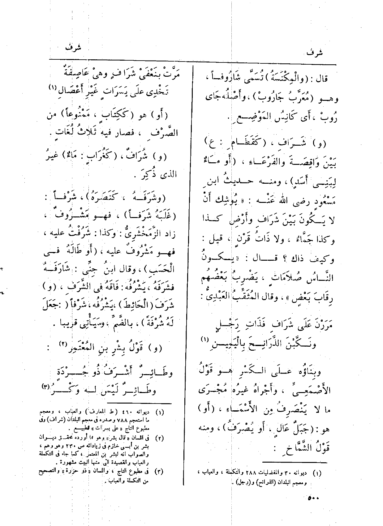 قَالَ: والْمِكْنَسَةُ تُسَمَّى شَارُوفاً، وَهُوَ مُعَرَّبُ جَارُوبْ، وأَصْلُه جَاي رُوبْ، أَي كَانِسُ المَوْضِعِ. شَرَافِ، كَقَطَامِ: ع بَيْنَ راقِصَةَ والفَرْعَاءِ، أَو مَاءٌ لِبَنِي أَسَدٍ، وَمِنْه حديثُ ابنِ مَسْعُودٍ رَضِي الله عَنْه:) يُوشِك أَن لَا يَكُونَ بَيْنَ شَرَافِ وأَرْضِ كَذَا وَكَذَا جَمَّاءُ، وَلَا ذَاتُ قرَْنٍ، قيل: وَكَيف ذَاك قَالَ (يكونُ النَّاسُ صُلاَمَاتٍ، يَضْرِبُ بَعْضُهُم رِقَابَ بَعْضٍ، وَقَالَ المُثَقِّبُ العَبْدِيُّ: