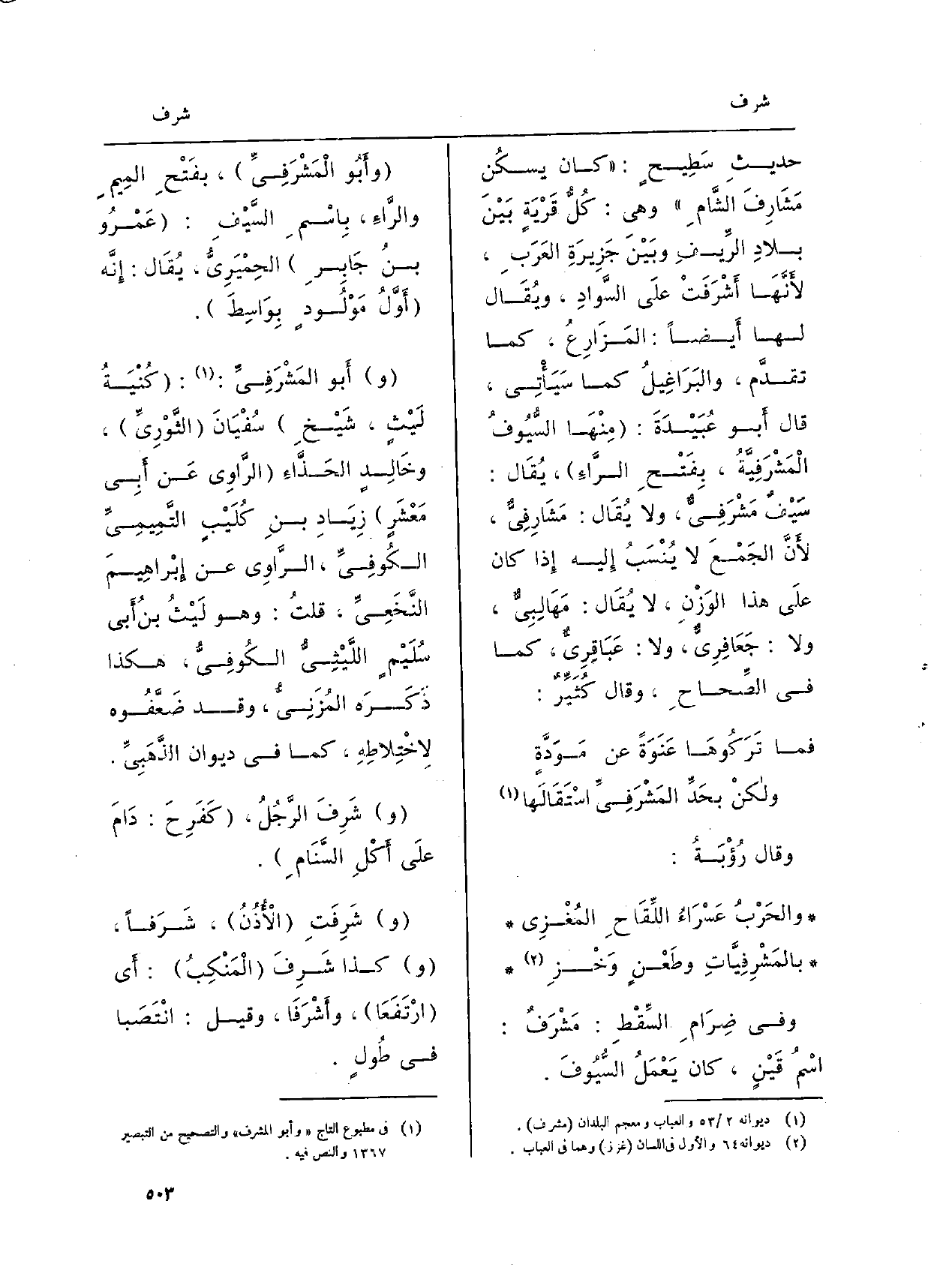 وأَبُو الْمَشْرَفِيِّ، بفَتْحِ المِيمِ والرَّاءِ، بِاسْمِ السَّيْفِ: عَمْرُو بنُ جَابرِ الحِمْيَريُّ، يُقَال: إِنَّه أَوَّلُ مَوْلُودٍ بِوَاسِطَ. أَبو المَشْرَفِيِّش: كُنْيَةُ لَيْثٍ، شَيْخِ سُفْيَانَ الثَّوْرِيِّ، وخَالِدٍ الحَذَّاءِ الرَّاوِي عَن أَبِي مَعْشَرٍ زِيَادِ بنِ كُلَيْبٍ التَّمِيمِيِّ الكُوفِيِّ، الرَّاوِي عَن إبْراهِيمَ النَّخَعِيِّ، قلتُ: وَهُوَ لَيْثُ بنُ أَبي سُلَيْمٍ اللَّيْثِيُّ الكُوْفِيُّ، هَكَذَا ذَكَرَه المُزَنِيُّ، وَقد ضَعَّفُوه لاِخْتِلاطِهِ، كَمَا فِي ديوَان الذَّهَبِيِّ. شَرِفَ الرَّجُلُ، كَفَرِحَ: دَامَ علَى أَكْلِ السِّنَامِ. شَرِفَتِ الأُذُنُ، شَرَفاً، كَذَا شَرِفَ الْمَنْكِبُ: أَي ارْتَفَعَا، وأَشْرَفَا، وَقيل: انْتَصَبا فِي طُولٍ.