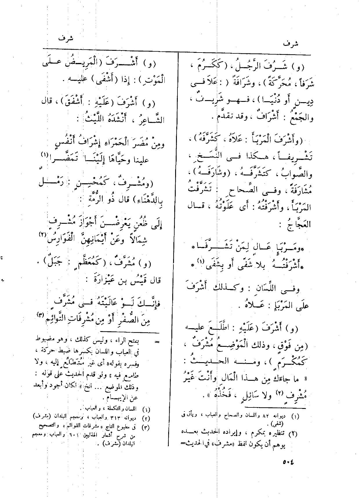 وأَشْرَفَ الْمَرْبَأَ: عَلاَهُ، كَشَرَّفَهُ، تَشْرِيفاً، هَكَذَا فِي النُّسَخِ، والصَّوابُ، كتَشَرَّفَهُ، وشَارَفَهُ، مُشَارَفَةً، وَفِي الصِّحاحِ: تَشَرَّفْتُ المَرْبَأَ، وأَشْرَفْتُهُ: أَي عَلَوْتُهُ، قَالَ العَجَّاجُ: ومَرْبَإِ عَالٍ لِمَنْ تَشَرَّفَا أَشْرَفْتُهُ بِلَا شَفىً أَو بِشَفَى وَفِي اللِّسَانِ: وَكَذَلِكَ أَشْرَفَ علَى المَرْبَإِ: عَلاهُ. أَشْرَفَ عَلَيْهِ: اطَّلَعَ عَلَيْهِ مِن فَوْقٍ، وَذَلِكَ الْمَوْضِعُ مُشْرَفٌ، كَمُكْرَمٍ، وَمِنْه الحديثُ:) مَا جاءَك مِن هَذَا الْمَالِ وأَنْتَ غَيرُ مُشْرِفٍ وَلَا سَائِلٍ، فَخُذْهُ (. أَشْرَفَ الْمَرِيضُ علَى الْمَوْتِ: إِذا أَشْفَى عَلَيْهِ.) أَشْرَفَ عَلَيْهِ: أَشْفَقَ، قَالَ الشَّاعِرُ، أَنْشَدَهُ اللَّيْثُ: