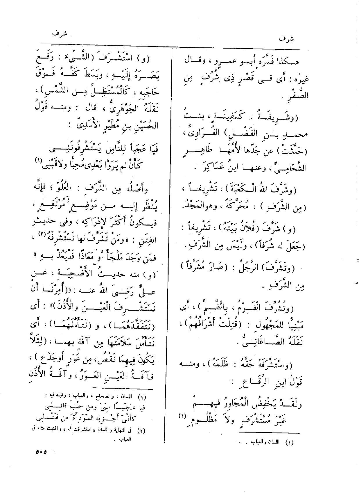 وأَصْلُه مِن الشَّرَفِ: العُلُوّ فإنَّه يُنْظَر إِليه من مَوْضِعٍ مُرْتَفِعٍ، فيكونُ أَكْثَرَ لإِدْرَاكِه، وَفِي حديثِ الفِتَنِ:) ومَنْ تَشْرَّفَ لَهَا تَسْتَشْرِفَهُ، فمَن وَجَدَ مَلْجَأً أَو مَعَاذاً فَلْيِعُذْ بِهِ (مِنْهُ حديثُ الأَضْحِيَهِ، عَن عليٍّ رَضِيَ اللهُ عَنهُ:) أُمِرْنَا أَن نَسْتَشْرِفَ الْعَيْنَ والأُذُنَ (: أَي نتفقدها ونتأملها أَي نَتَأَمَّلَ سَلاَمَتَهَا مِن آفَةٍ بهما، لِئَلاَّ يَكُونَ فِيهِمَا نَقْصٌ، مِن عَوَرٍ أَو جَدْع، فآفَةُ العَيْنِ العَوَرُ، وآفَةُ الأُذُنِ