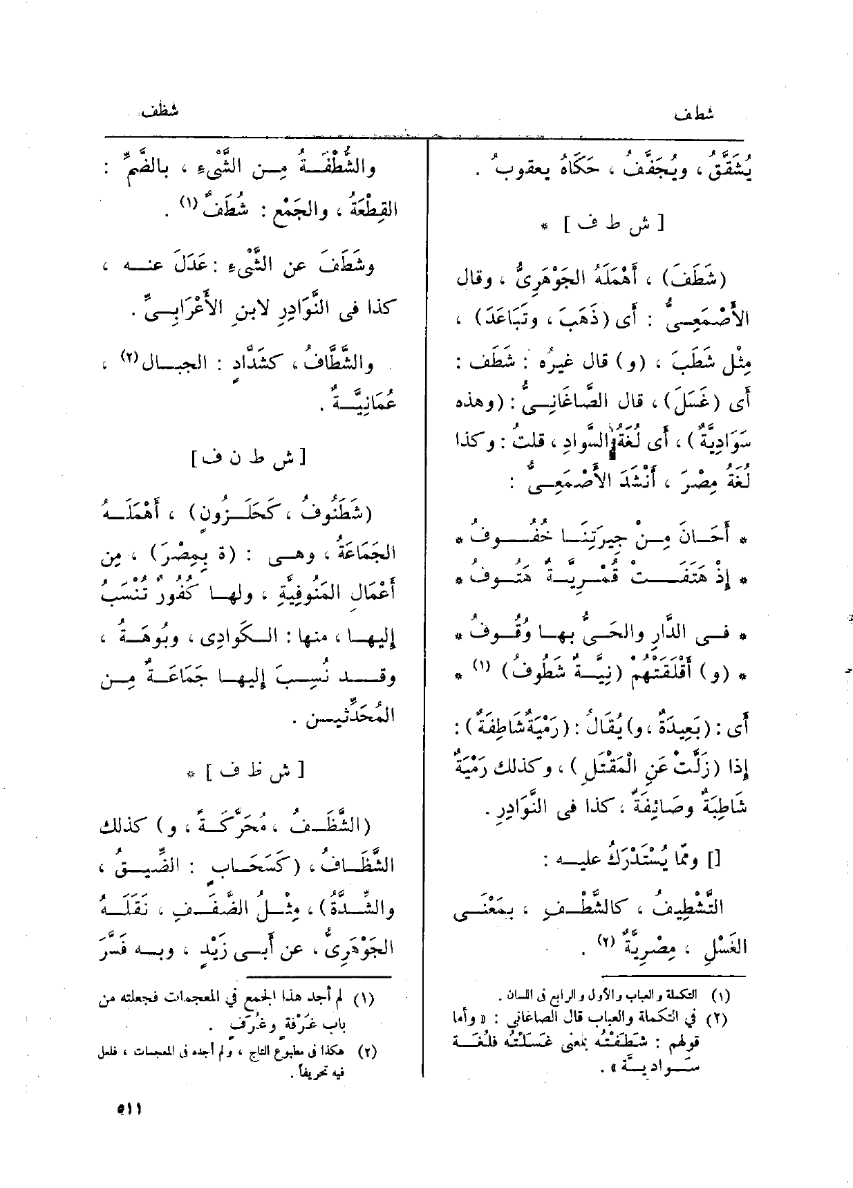 شَطَفَ، أَهْمَلَهُ الجَوْهَرِيُّ، وَقَالَ الأَصْمَعِيِّ: أَي: ذَهَبَ، وتَبَاعَدَ، مِثْل شَطَبَ، وَقَالَ غيرُه: شَطَف: أَي غَسَلَ، قَالَ الصَّاغَانِيُّ: وَهَذِه سَوَادِيَّةٌ، أَي لُغَةُ السَّوادِ، قلتُ: وَكَذَا لُغَةُ مِصْرَ، أَنْشَدَ الأَصْمَعِيِّ: أَحَانَ مِنْ جِيرَتِنْا خُفُوفُ إِذْ هَتَفَتْ قُمْرِيَّةٌ هتوف فِي الدَّارِ والحَىُّ بهَا وُقُوفُ وأَقْلَقَتْهُمْ نِيَّةٌ شَطُوفُ أَي: بَعِيدَةٌ، ويُقَالُ: رَمْيَةٌ شَاطِفَةٌ: إِذا زَلَّتْ عَنْ الْمَقْتَلِ، وَكَذَلِكَ رَمْيِةٌ شَاطِبَةٌ وصَائِفَةٌ، كَذَا فِي النَّوَادِرِ.
