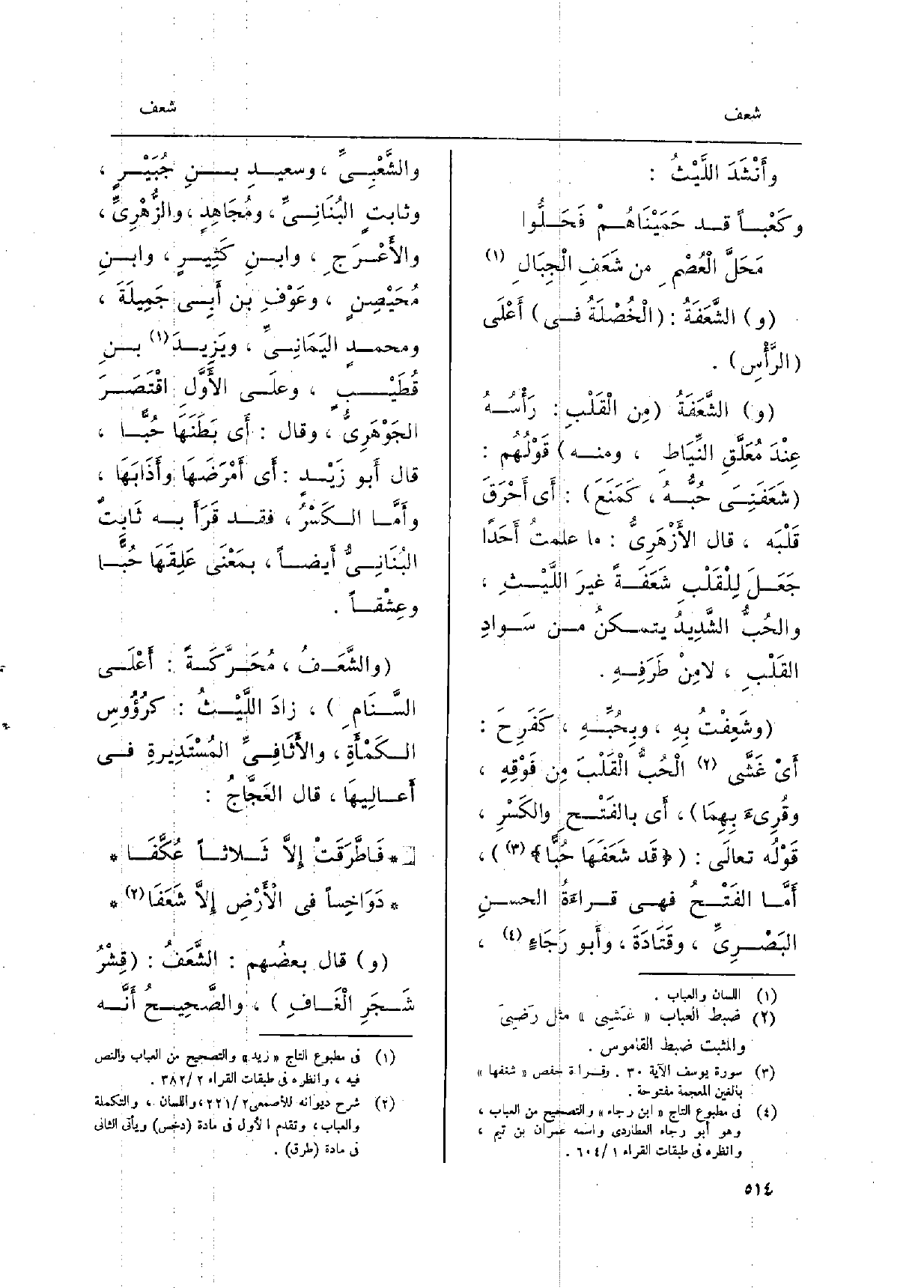 وشَعِفْتُ بِهِ، وبِحُبِّهِ، كَفَرِحَ: أَيْ غَشَّى الْحَبُّ الْقَلْبُ مِن فَوْقِهِ، وقُرئَ بِهِمَا، أَي بالفَتْحِ والكَسْرِ، قَوْلُه تعالَى:) قَد شَعَفَهَا (، أَمَّا الفَتْحُ فَهِيَ قراءَةُ الحسنِ البَصْرِيِّ، وقَتَادَةَ، وأَبو رَجَاءٍ، والشَّعْبِيِّ، وَسَعِيد بن جُبَيْرٍ، وثابتٍ البُنَانِيِّ، ومُجَاهِدٍ والزُّهْرِيَّ، والأَعْرَجِ، وابنِ كَثِيرٍ، وابنِ مُحَيْصِنٍ،)
