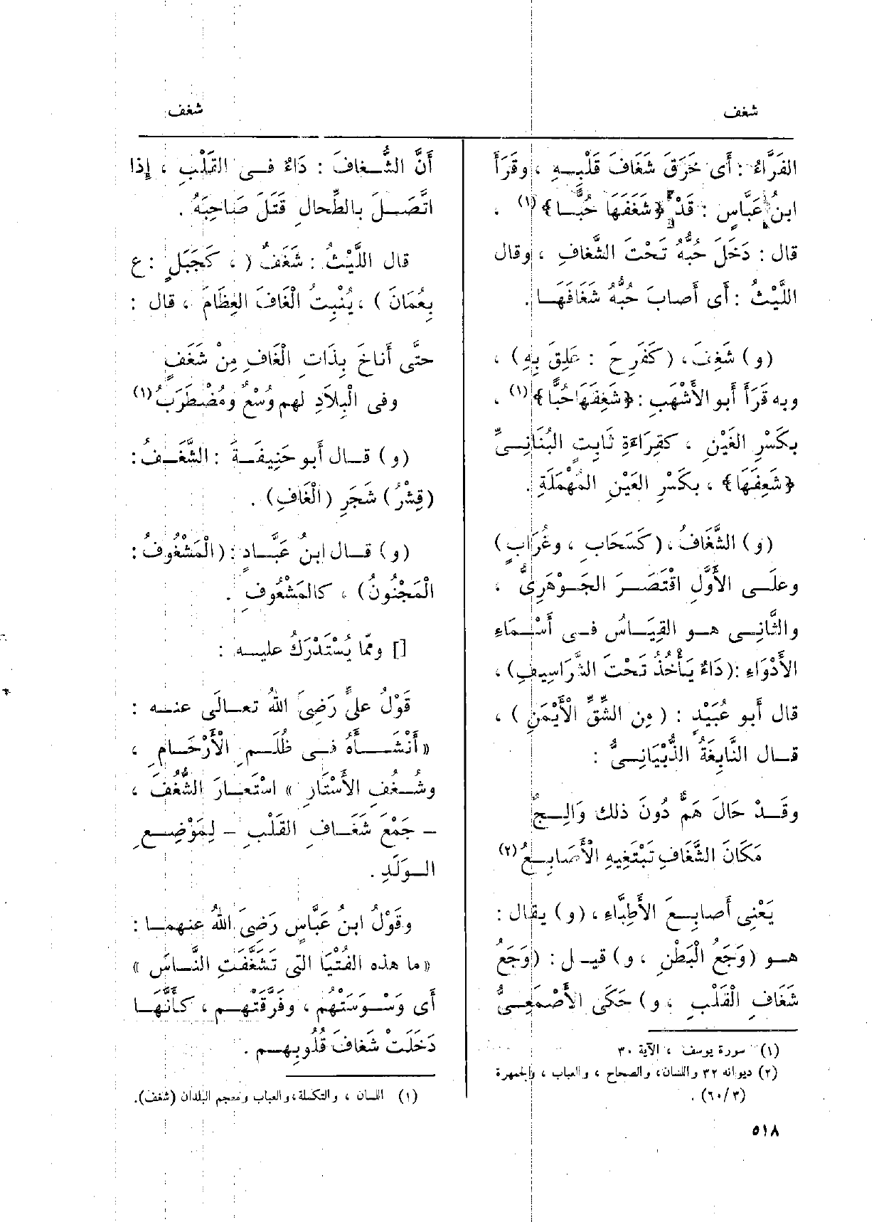 الفَرَّاءُ: أَي خَرَقَ شَغَافَ قَلْبِهِ، وقَرَأَ ابنُ عَبَّاسٍ: قَدْ) شَعَفَهَا حُبّاً (، قَالَ: دَخَلَ حُبُّهُ تَحْتَ الشَّغافِ، وَقَالَ اللَّيْثُ: أَي أَصابَ حُبُّهُ شَغَافَهَا. شَغِفَ، كَفَرِحَ: عَلِقَ بِهِ، وَبِه قَرَأَ أَبو الأَشْهَبِ:) شَغِفَهَا حُبّاً (، بكَسْرِ الغَيْنِ، كقِرَاءَةِ ثَابِتٍ البُنَانِيِّ) شَعِفَهَا (، بكَسْرِ العَيْنِ المُمْلَةَ. ِ الشَّغَافُ، كَسَحَابِ، وغُرَابٍ وعلَى الأَوَّلِ اقْتَصَرَ الجَوْهَرِيُّ، والثَّانِي هُوَ القِيَاسُ فِي أَسْمَاءِ الأَدْوَاءِ: دَاءٌ يَأْخُذُ تَحْتَ الشَّرَاسِيفِ، قَالَ أَبو عُبَيْدٍ: مِن الشِّقّ الأَيْمَنِ، قَالَ النَّابِغَةُ الذُّبْيَانِيُّ: