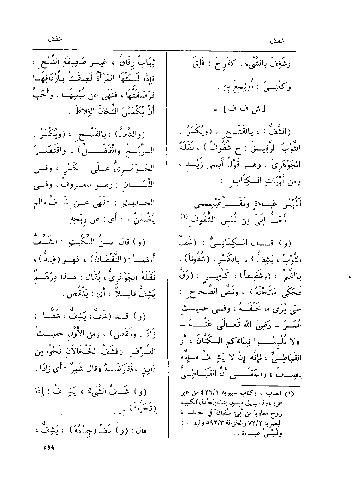 (لَلُبْسُ عَباءَةٍ وتَقَرَّ عَيْنِي ... أَحَبُّ إِلَيّ مِن لُبْسِ {الشُّفُوفِ)