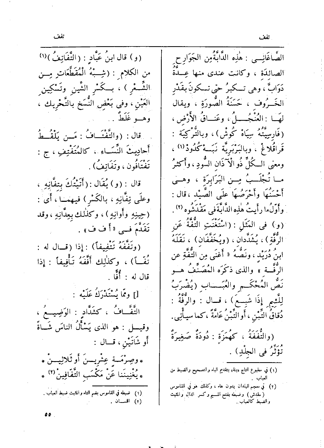 الصَّاغَانيُّ: هذِه الدَّابَّةُ مِن الجَوَارِحِ الصائِدَةِ، وَكَانَت عِنْدِي مِنْهَا عدَّةُ دَوَابَّ، وَهِي تكبرُ حَتَّى تكونَ يقَدْرِ الخَرُوفِ، حَسَنةُ الصُّورَةِ، وَيُقَال لهَا: العُنْجُلُ، وعَناقُ الأَرْضِ، فَارِسِيَّتُهُ سِيَاهُ كُوشْ، وبالتُّرْكِيَة: قَرقُلاغْ، وبالبَرْبَريَّة نَبَهْ كُدُودْ، ة وَمعنى الكُلِّ ذُو الآذَانِ السُّودِ، وأَكثرُ مَا تُجْلَبُ من البَرَابِرَةِ، وَهِي أَحْسَنُهَا وأَحْرَصُهَا عَلَى الصَّيْدِ، قَالَ: وأَوّلُ مَا رأَيتُ هذِه الدَّابَّةَ فِي مَقْدَشُوه. فِي المَثَلِ: اسْتَغْنَتِ التُّفَّةُ عَن الرُّفَّةِ (، يشددان ويخفقان نَقله ابْن دُرَيْد وَنَصه أغْنى من التفه عَن الرفه وَالَّذِي ذكَرَه المُصَنِّفُ هُوَ نَصُّ المُحْكَمِ والعُبَابِ يُضْرَبُ لِلَّئِيمِ إِذَا شَبِعَ، قَالَ والرُّفَّةُ: دُقاقُ التِّبْنِ، أَو التِّبْنُ عَامَّةً، كَمَا سيأْتِي.